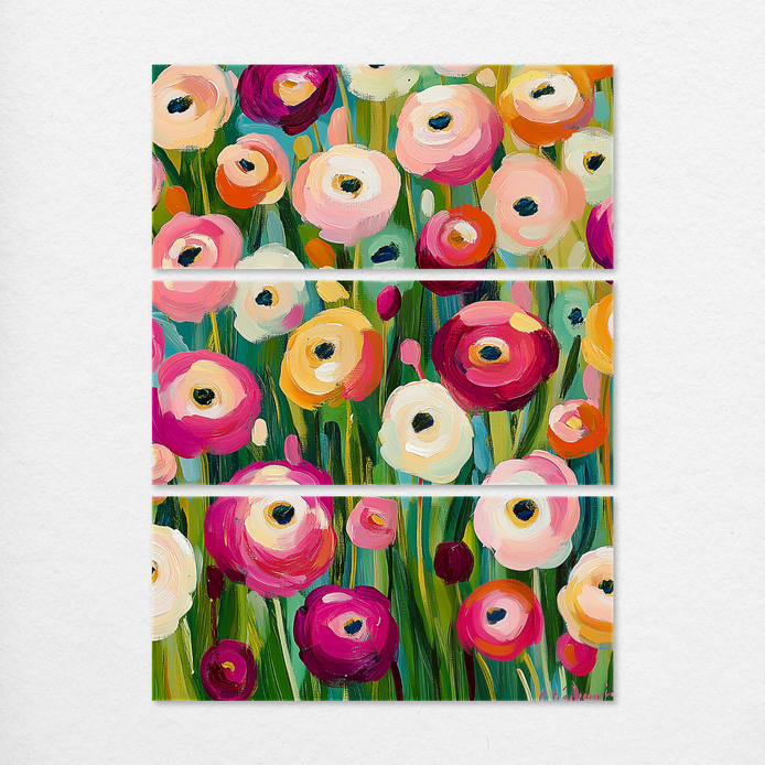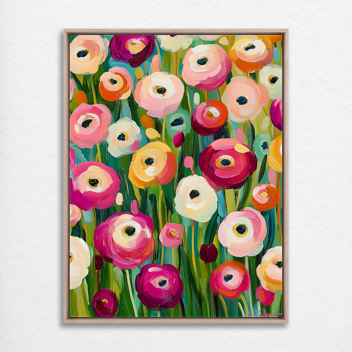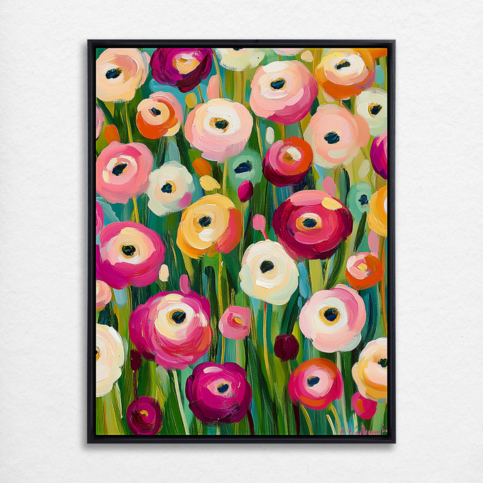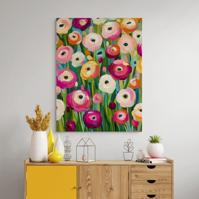 This composition showcases a vibrant spectacle of colorful blooms, immediately creating a delightful and cheerful mood. The lively palette and dynamic flow make this piece a striking maximalist focal point. It is an ideal decorative statement for energizing living rooms, dining areas, or patio spaces.
