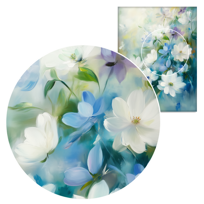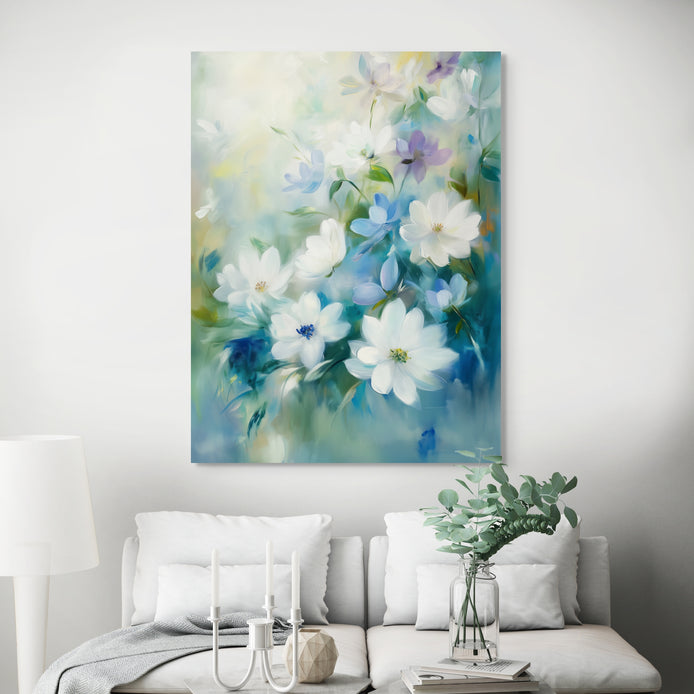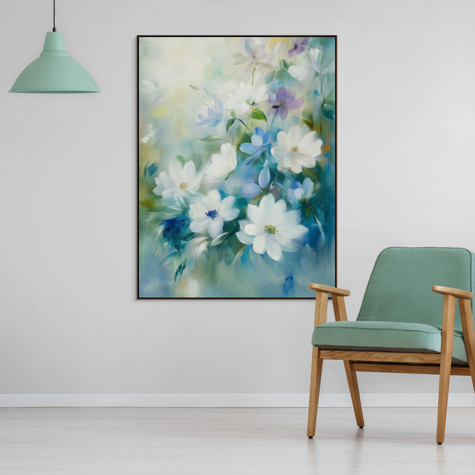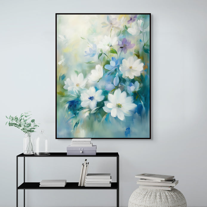 A lovely arrangement of white flowers instills a serene, dreamy atmosphere. The composition features a calming, impressionist style set against a soft blue background, defining a tranquil aesthetic. This piece is an ideal decorative accent for living rooms, bedrooms, or kitchens.