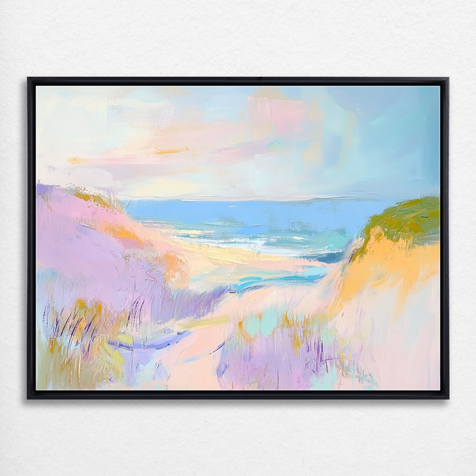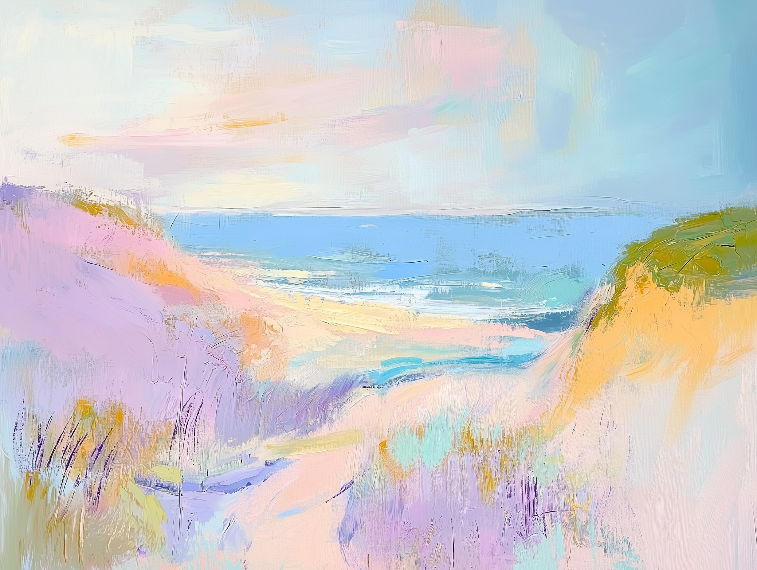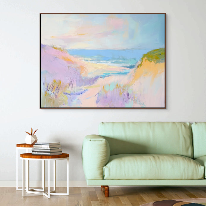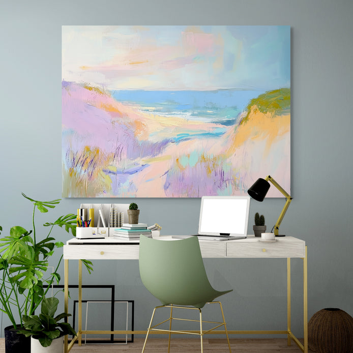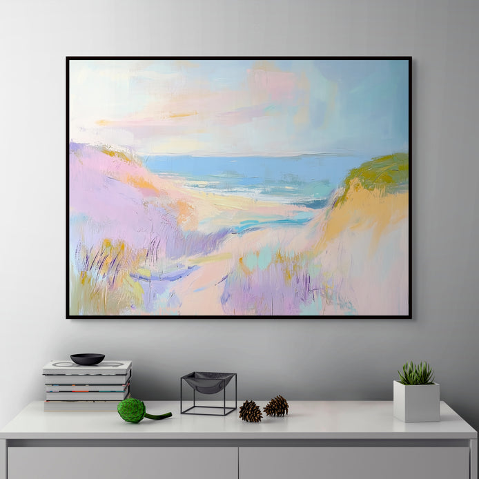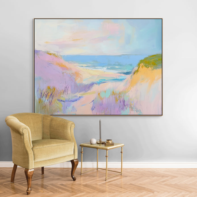 Hand-painted wall art featuring a tranquil coastal view with soft pastel hues capturing waves lapping against sandy shores. This original artwork showcases a serene natural setting.