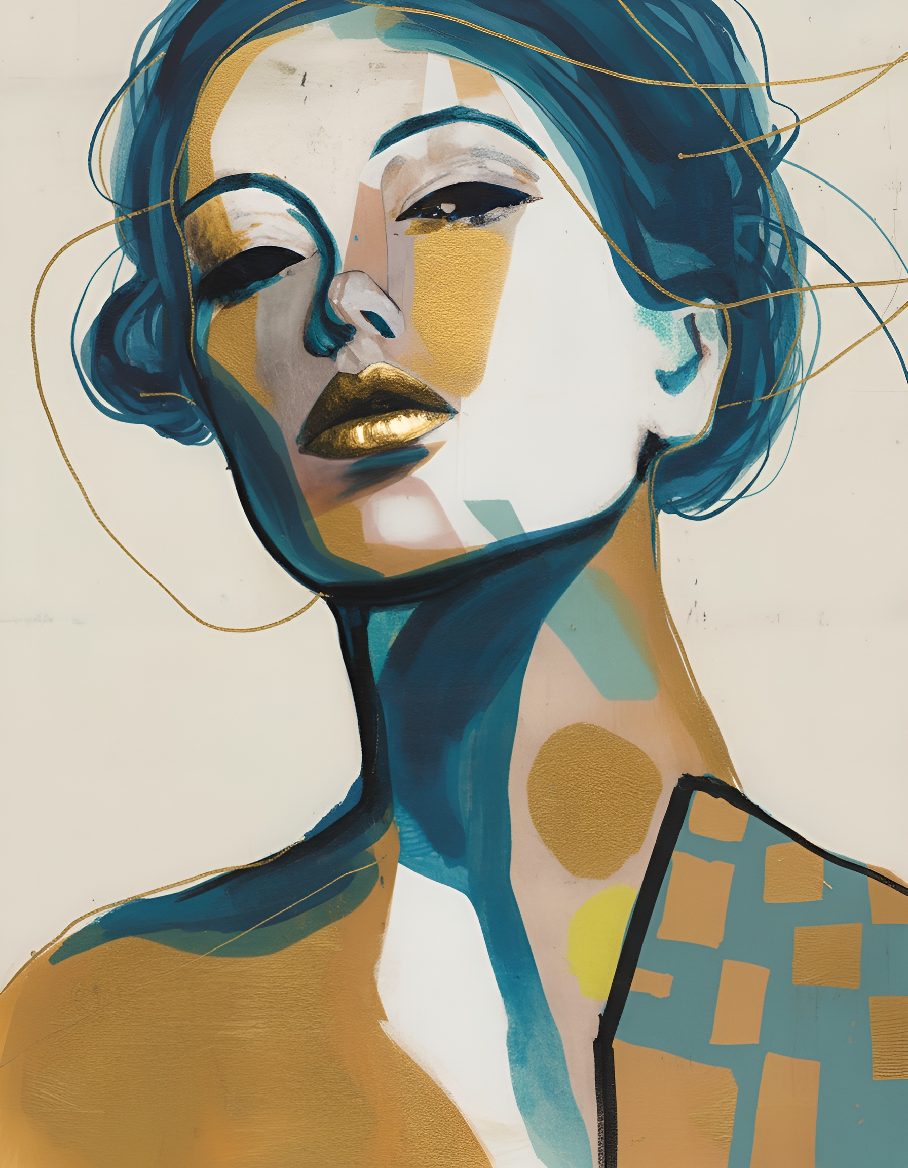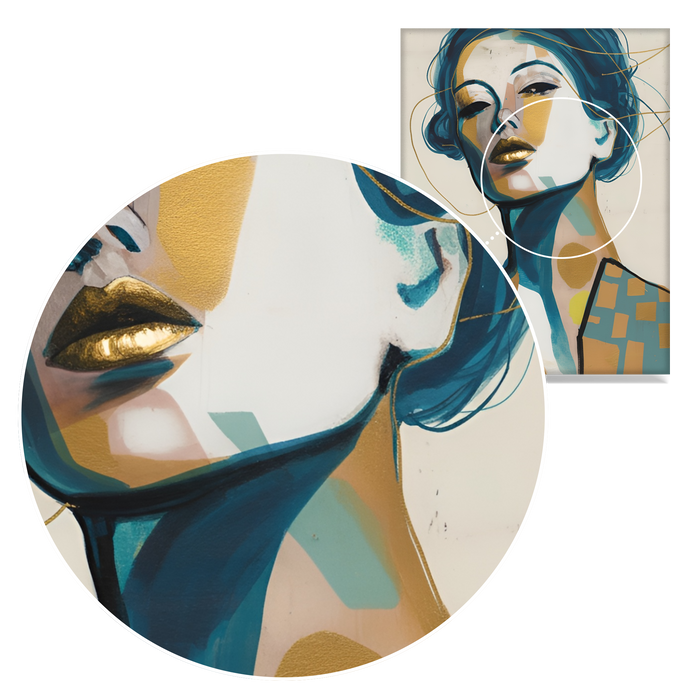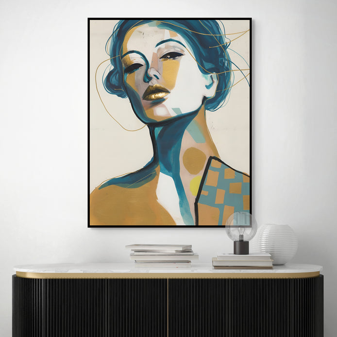 A captivating portrait of a woman commands attention with a mood of luxurious drama. The composition features a bold blend of gold and blue hues, using intricate detailing to create profound visual depth. This sophisticated piece is ideal for elevating living rooms, bedrooms, or dining areas.