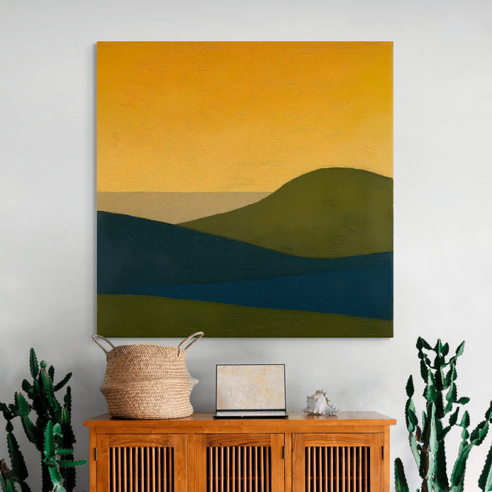 This hand-painted wall art captures the serene beauty of rolling hills under a warm sunset. The rich textures and colors evoke a calming atmosphere, perfect for enhancing any space.