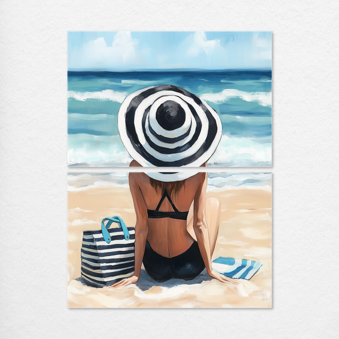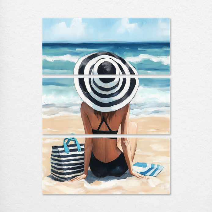 This hand-painted wall art features a serene beach scene with a woman in a striped sun hat sitting on the sandy shore. The tranquil ocean waves and bright sky create a vibrant atmosphere.