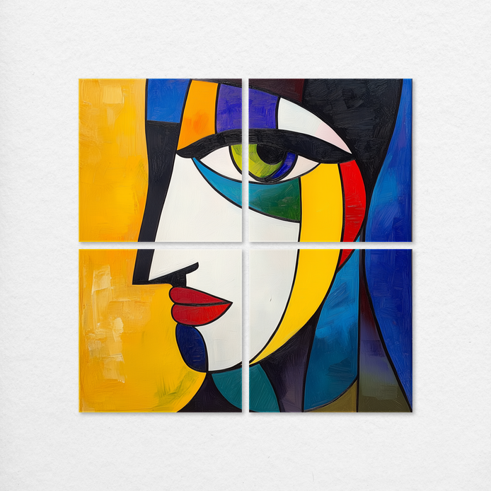 This striking abstract portrait commands attention with a dynamic presence and energetic mood. The composition features bold geometric shapes layered with vibrant hues, creating a visually compelling, modern focal point. This piece is ideal for adding stylish flair to living rooms, bedrooms, dining areas, hallways, or offices.