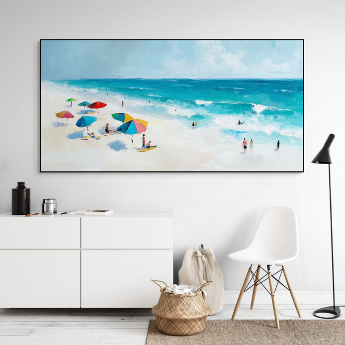 Hand-painted wall art showcasing a lively beach filled with colorful umbrellas, sunbathers, and gentle ocean waves. The original artwork embodies a joyful summer atmosphere and sunshine.