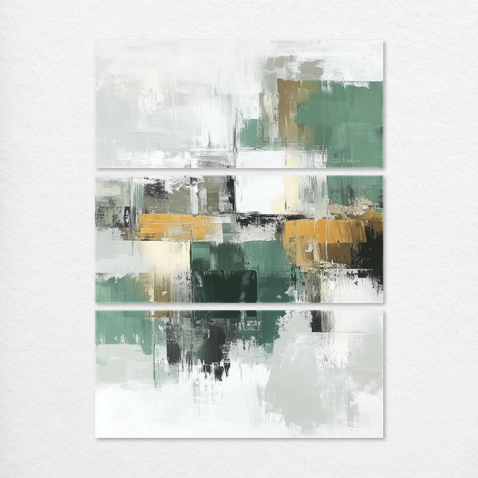 A modern abstract composition instills a mood of serene balance. The design features dynamic forms in a sophisticated palette of soothing green and earthy gold. This elegant statement is ideal for enhancing living rooms, bedrooms, or offices.