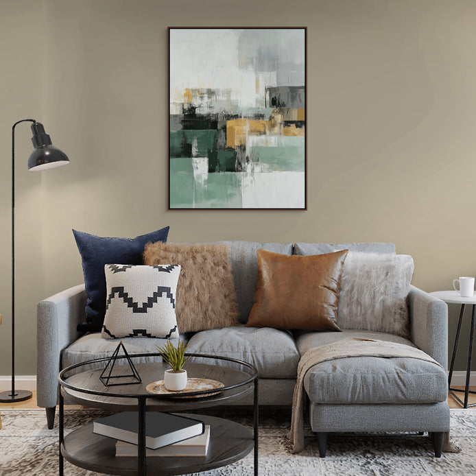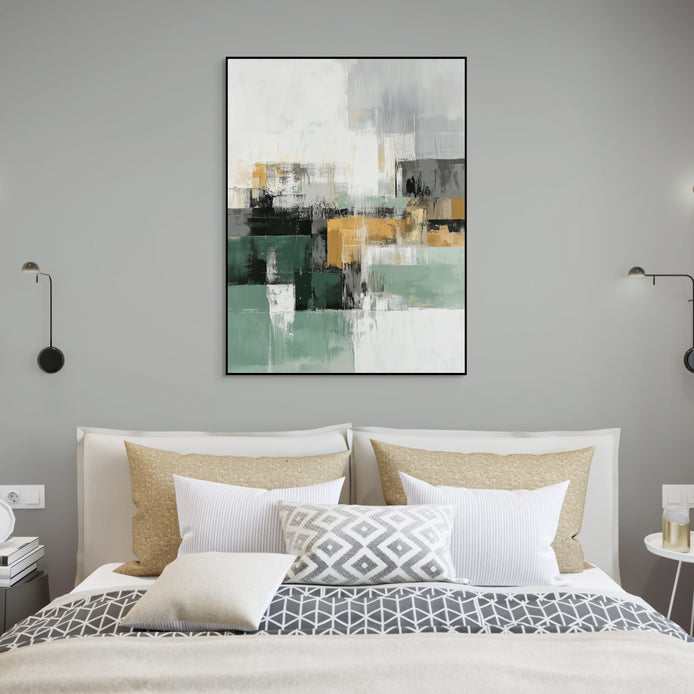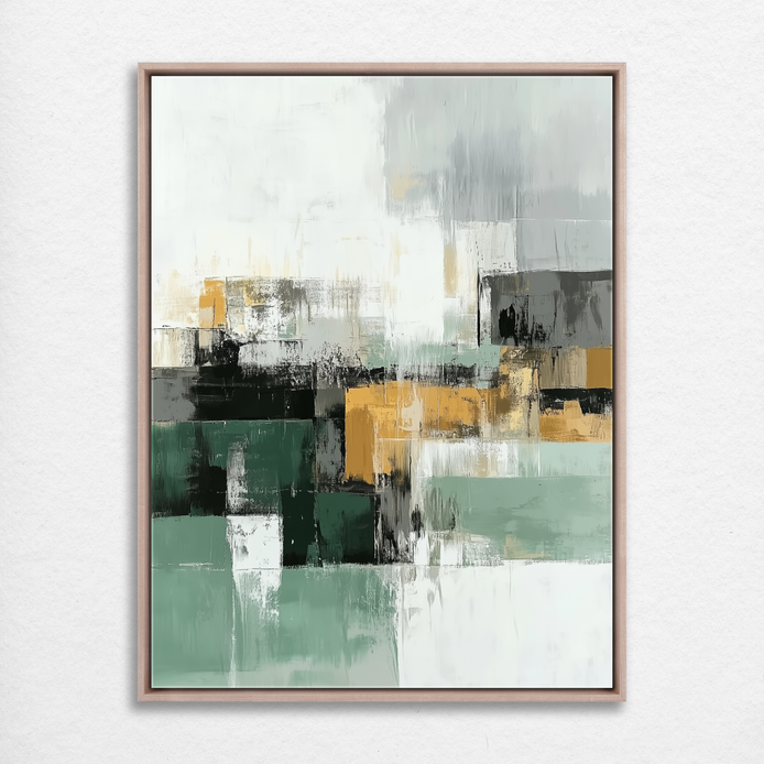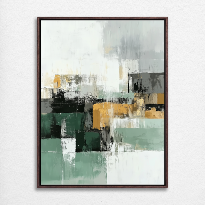 This hand-painted artwork presents a rich tapestry of abstract shapes and textures, blending soothing greens, bold blacks, and warm yellows.