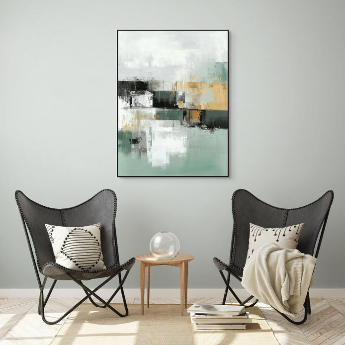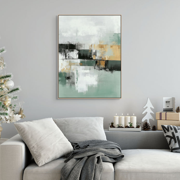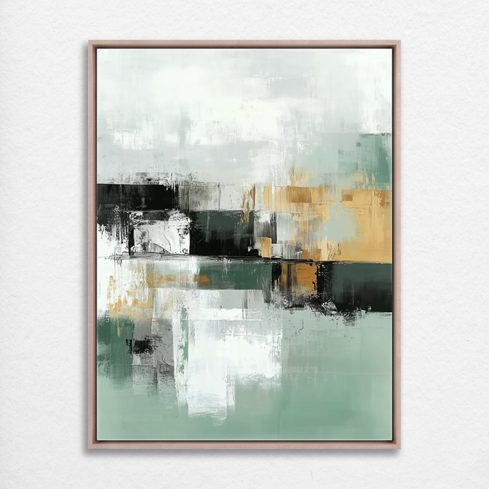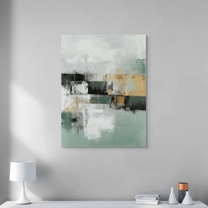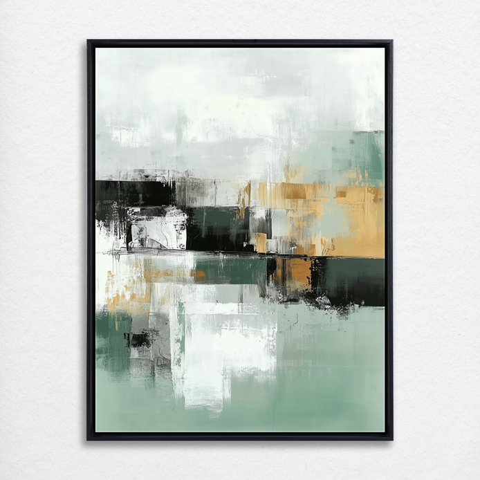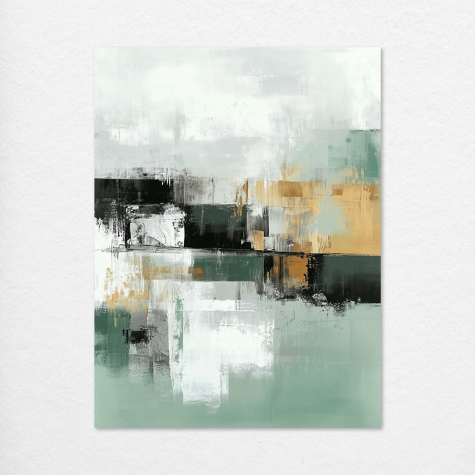This hand-painted artwork showcases a blend of soft greens, blacks, and golden hues, forming a modern abstract composition.