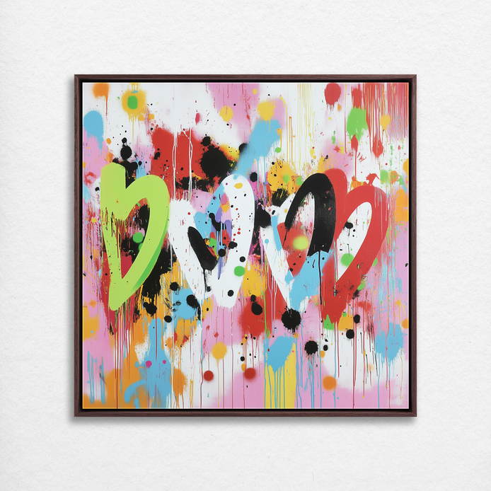 This vibrant hand-painted wall art features expressive heart shapes in a joyful cascade of color, radiating warmth and feeling.