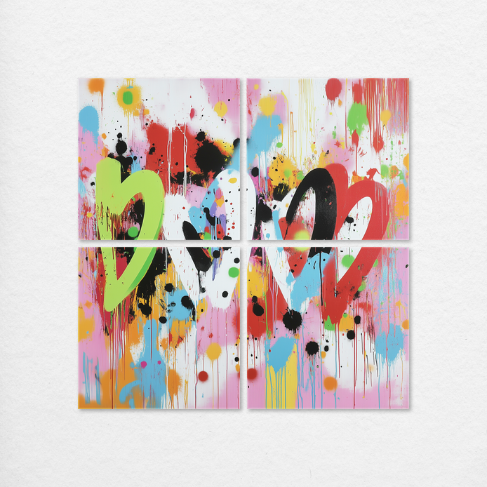 Expressive heart shapes cascade in a dynamic visual, instantly radiating a mood of joy and warmth. This maximalist composition features a vibrant blend of colors and rich texture. It is an ideal statement piece for energizing living rooms, bedrooms, dining areas, hallways, or patio spaces.