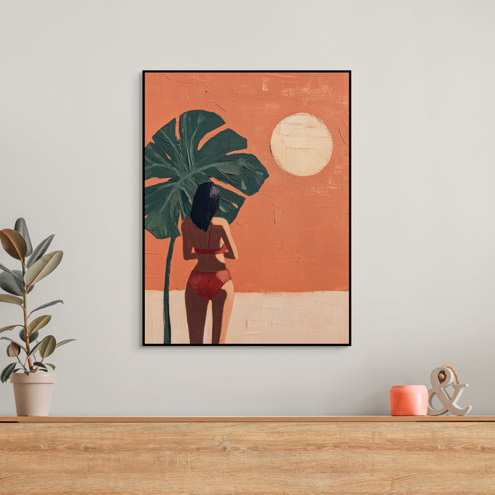 Hand-painted wall art showcases a woman in a red bikini admiring a large sun and palm tree. Rich orange tones create a warm atmosphere, perfect for adding character to any space.