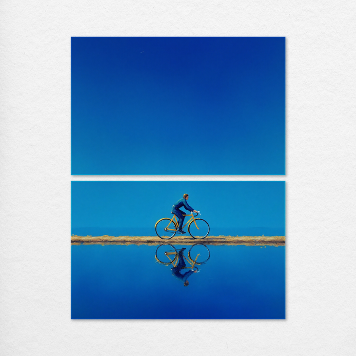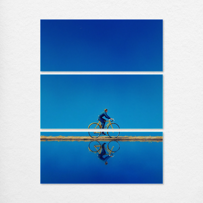 This hand-painted wall art features a cyclist in blue attire riding alongside still waters under a clear azure sky. The artwork captures peacefulness and movement in a stunning scene.