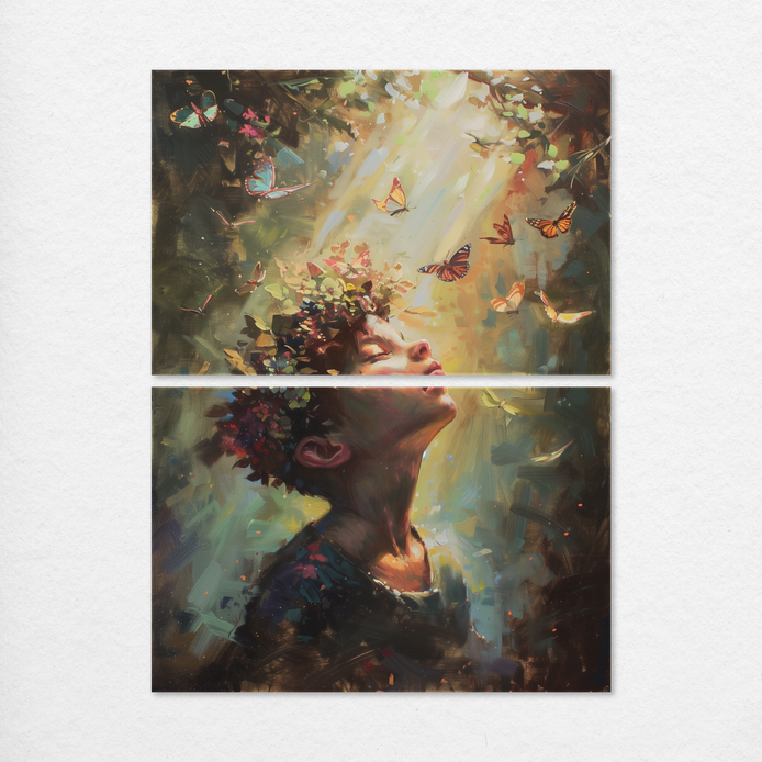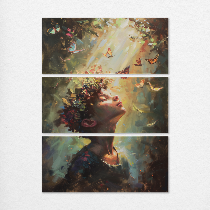 A dreamy composition features butterflies fluttering through lush greenery, radiating an ethereal glow and inviting a mood of fantasy and harmony. The design is defined by dappled sunlight and a vibrant color palette, creating an evocative aesthetic. This piece is ideal for adding stylish decor to living rooms, bedrooms, dining areas, hallways, or kids’ rooms.