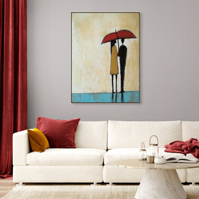 Two silhouetted figures share a red umbrella against a soft, textured background. This hand-painted minimalist piece speaks to love, companionship, and comfort���perfect for cozy corners or as a thoughtful gift.