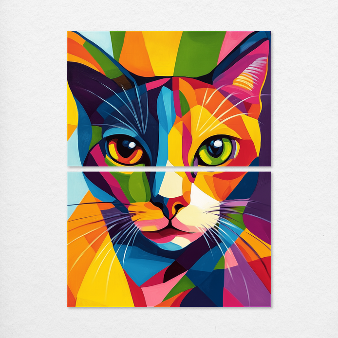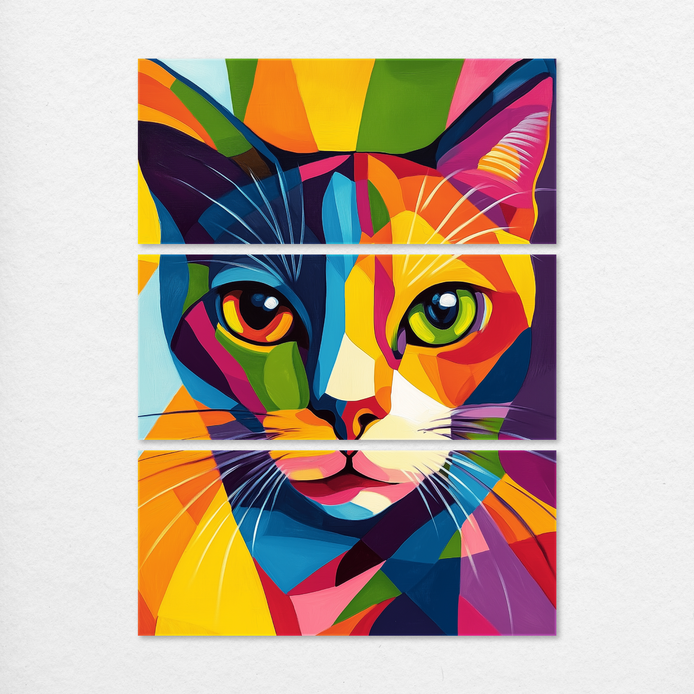 A captivating cat portrait establishes a modern, energetic mood. The composition is defined by bold geometric shapes and vibrant colors, creating a dynamic visual statement. This striking piece is ideal for energizing living rooms, bedrooms, dining areas, hallways, or kids’ rooms.