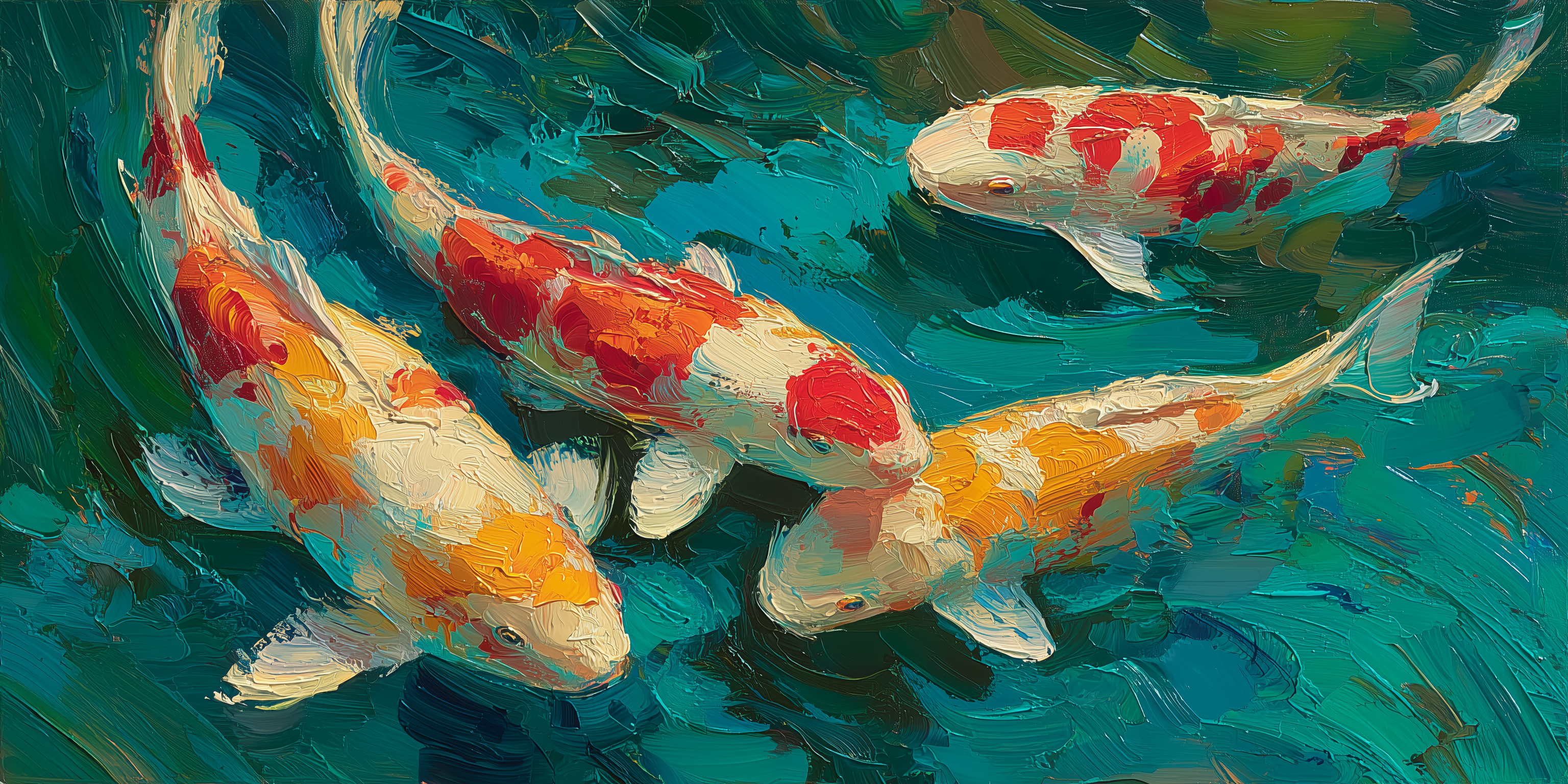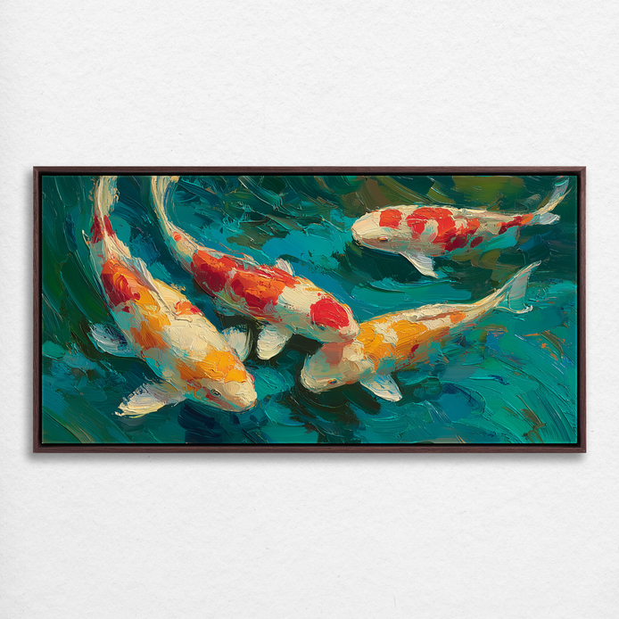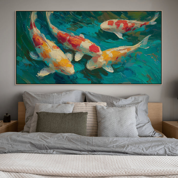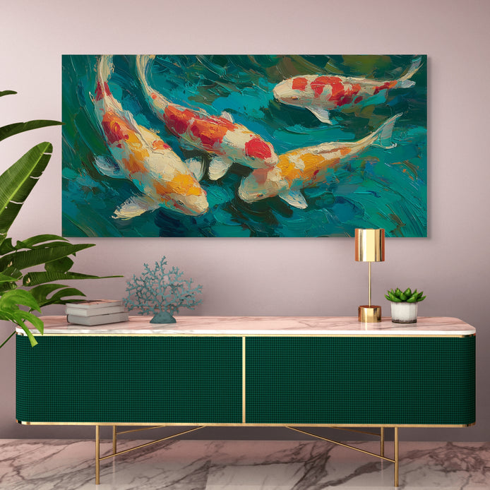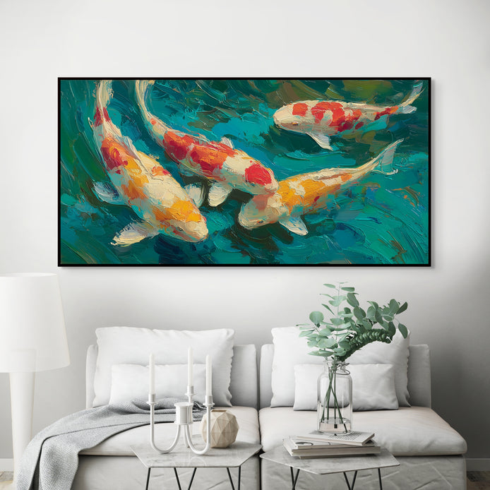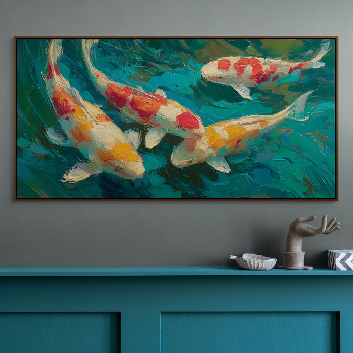 Experience the beauty of koi fish gracefully swimming in rich turquoise waters. This hand-painted wall art showcases vibrant colors and intricate details, perfect for art enthusiasts.