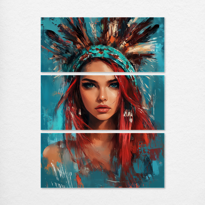 This bold, expressive portrait commands immediate attention, radiating strength and layered emotion through its visual impact. The maximalist composition features a fiery headdress and vivid contrasts, utilizing dramatic texture to enhance the subject's powerful presence. This striking focal point is ideal for elevating living rooms, dining areas, hallways, or sophisticated office spaces.