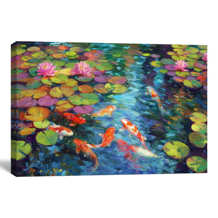 This artwork showcases colorful koi fish swimming gracefully among lush green lily pads and delicate pink water lilies. Hand-painted wall art brings nature's beauty to life.