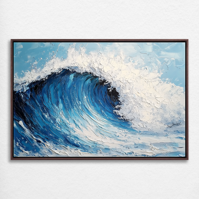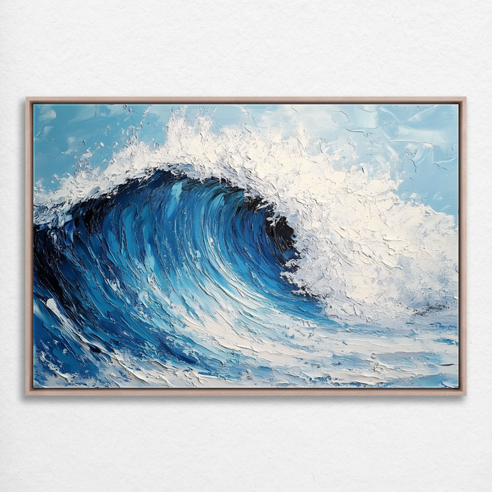This hand-painted wall art features a powerful ocean wave crashing with vibrant blue tones and intricate textures, bringing the energy of the sea to your space.