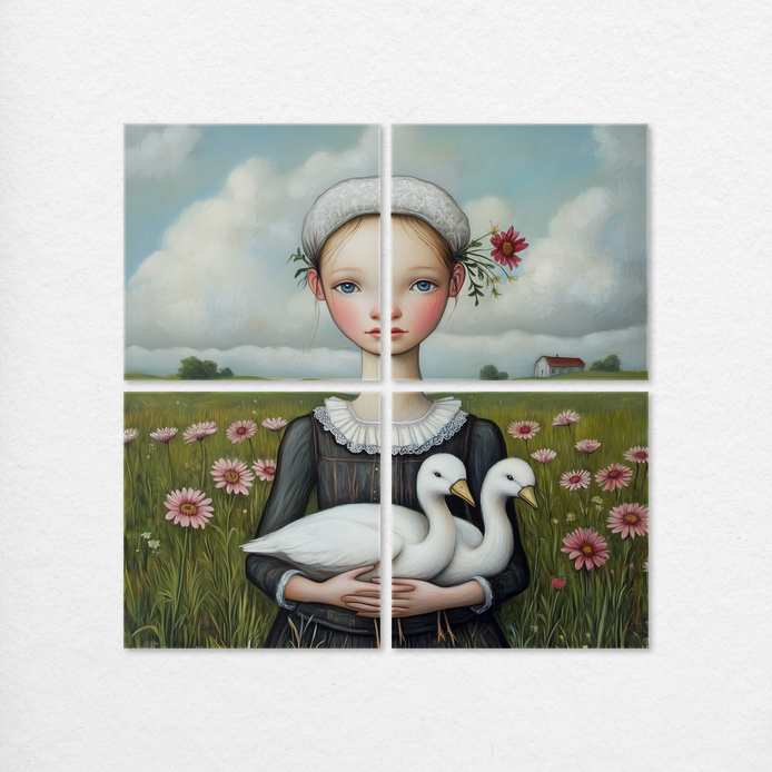 This serene portrait captures a young girl and two white ducks in a pastoral field, evoking a deep sense of nostalgia and quiet simplicity. The composition utilizes soft, muted tones and delicate textures for a charming, timeless visual aesthetic. This piece serves as an ideal decorative accent for living rooms, bedrooms, or kitchens.