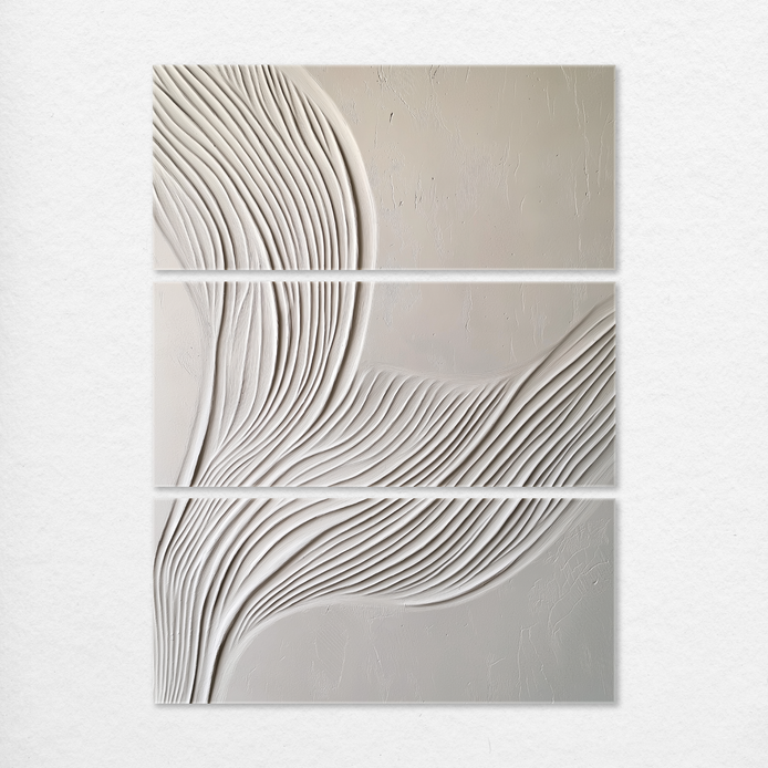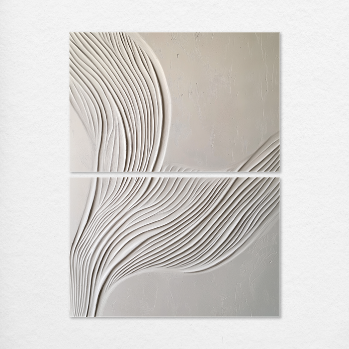 Flowing white lines evoke a mermaid’s tail, instilling a mood of refined depth and ethereal charm. This minimalist composition utilizes sculptural texture and a calming palette to create a subtle yet elegant visual rhythm. It offers an ideal aesthetic for sophisticated living rooms, bedrooms, or offices.