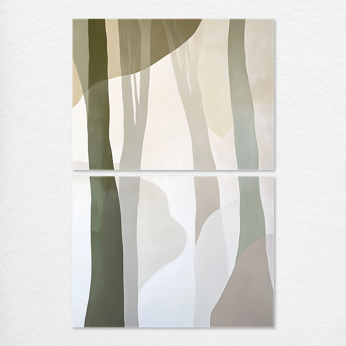 This modern abstract composition captures the profound calm and serenity of nature through gentle tree silhouettes. The design uses soft, earthy hues to define a subtle, minimalist aesthetic. It is an ideal decorative complement for living rooms, bedrooms, dining areas, hallways, or offices.