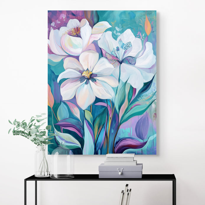 This hand-painted wall art showcases large white flowers elegantly blooming against a vibrant abstract background.