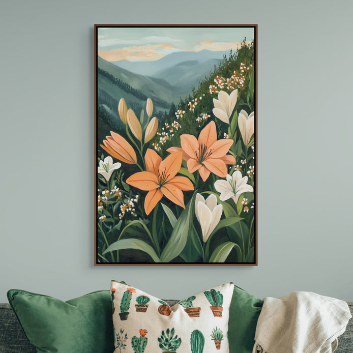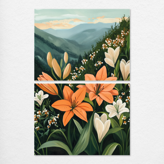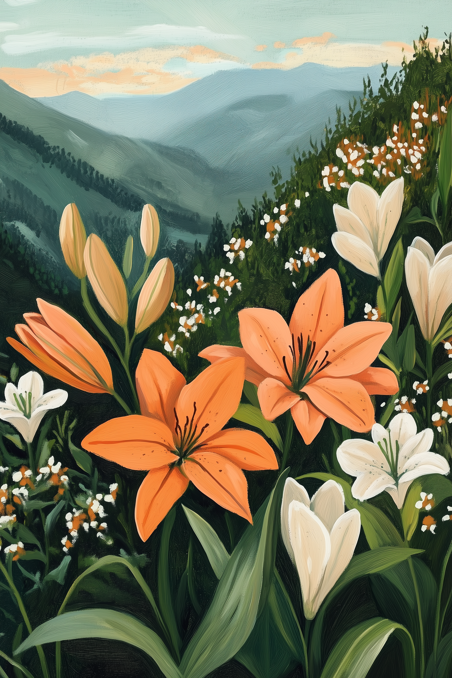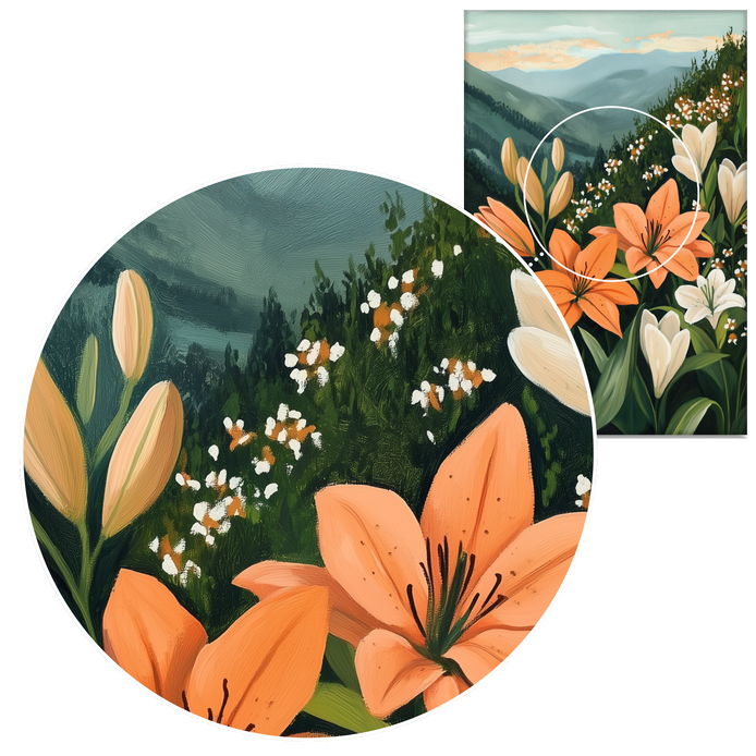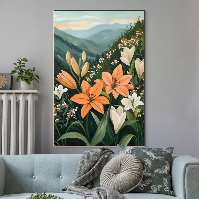 This hand-painted wall art showcases stunning orange and white lilies flourishing amidst lush greenery and soft mountains. A peaceful landscape captures the beauty of nature and tranquility.