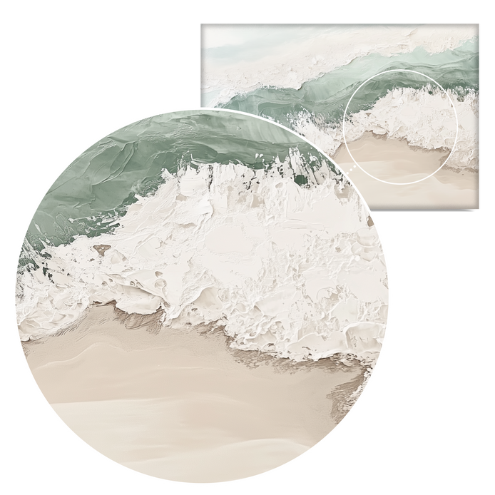 This textured hand-painted piece captures the raw beauty of a wave crashing onto the shore. Carefully layered with creamy whites and soft greens, it creates a tactile depiction of motion and serenity. It is a unique representation of the ocean's timeless allure.
