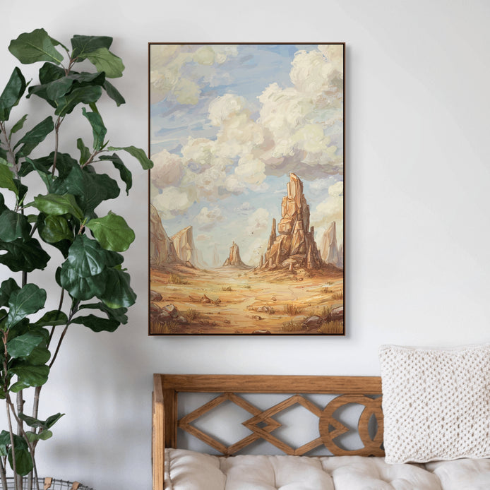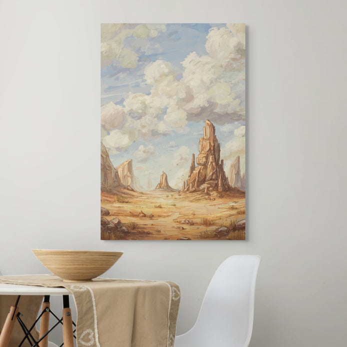 This hand-painted wall art features a serene desert landscape showcasing majestic rock formations beneath a dramatic sky filled with soft clouds.