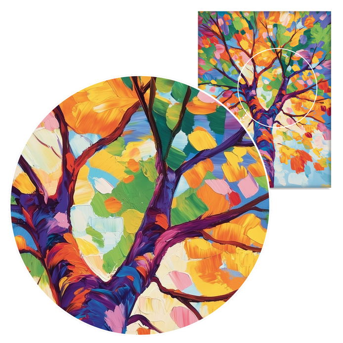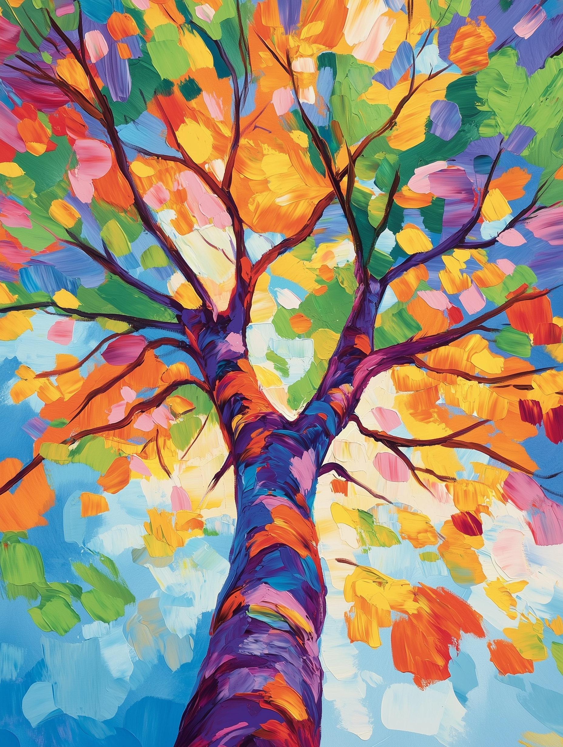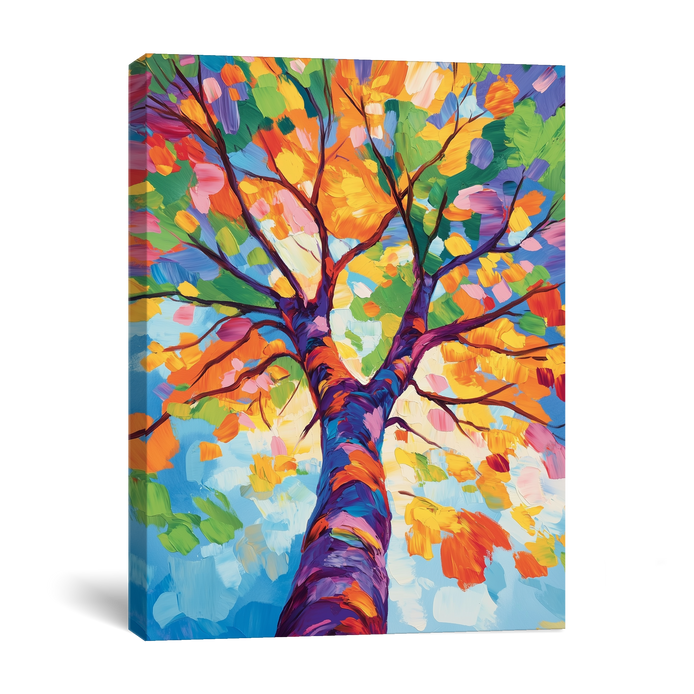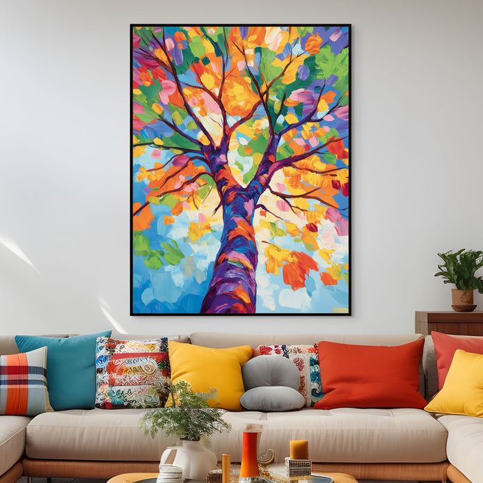 This hand-painted wall art features a towering tree with a rich trunk and a vibrant canopy of colorful leaves. The warm hues of autumn create a lively atmosphere, perfect for any art lover.
