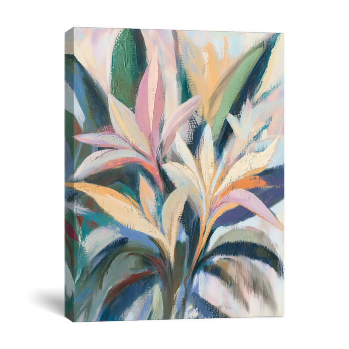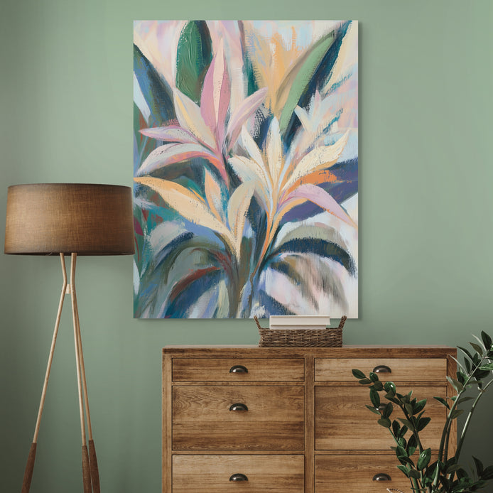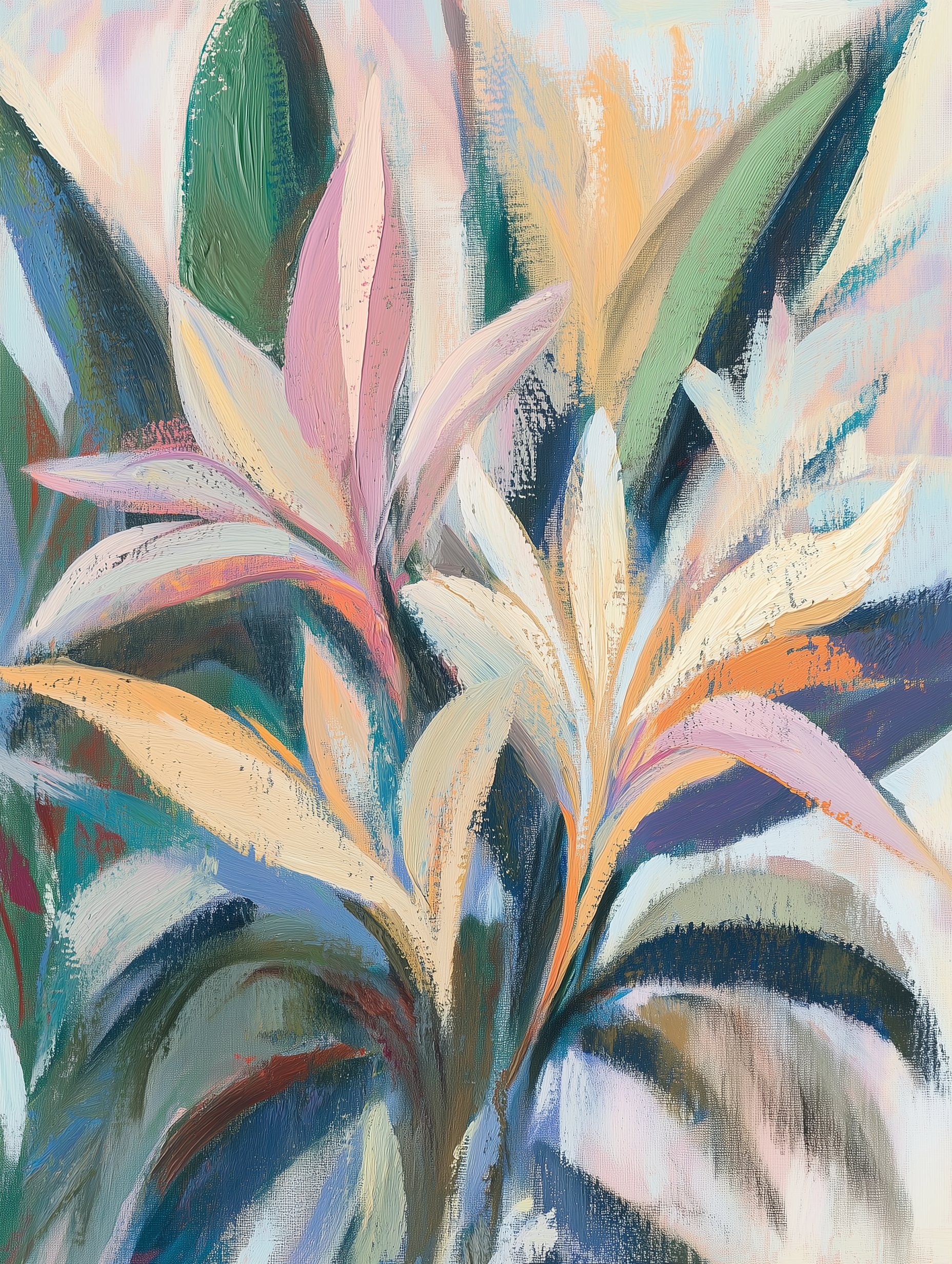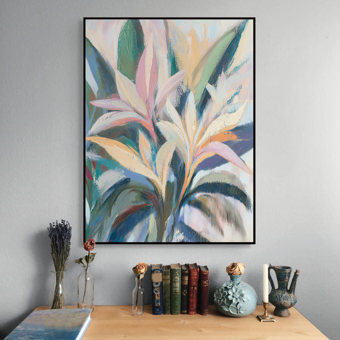 This abstract composition of beautiful pastel blooms and bold leaves creates a lively, fresh mood. The design features an abstract style utilizing soft, colorful tones intertwined with strong forms. It is an ideal statement piece for elevating living rooms, offices, or bedrooms.