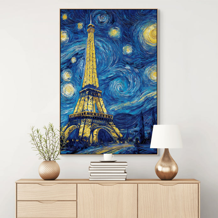 This hand-painted wall art captures the iconic Eiffel Tower under a swirling night sky filled with stars. The vibrant colors and expressive brushstrokes highlight the beauty of this urban scene.