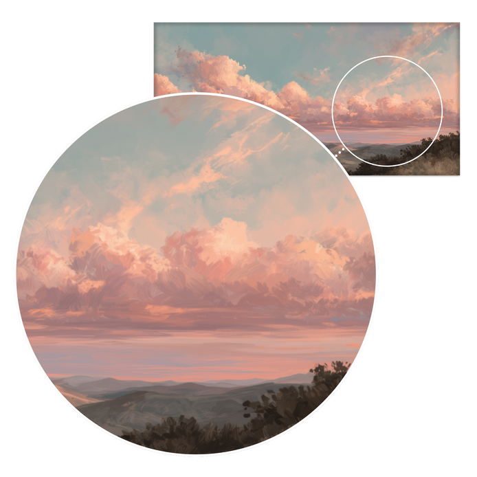 This hand-painted wall art features a breathtaking sunset illuminating rolling hills beneath a sky filled with soft, pink clouds. The tranquil scene invites calm and serenity.