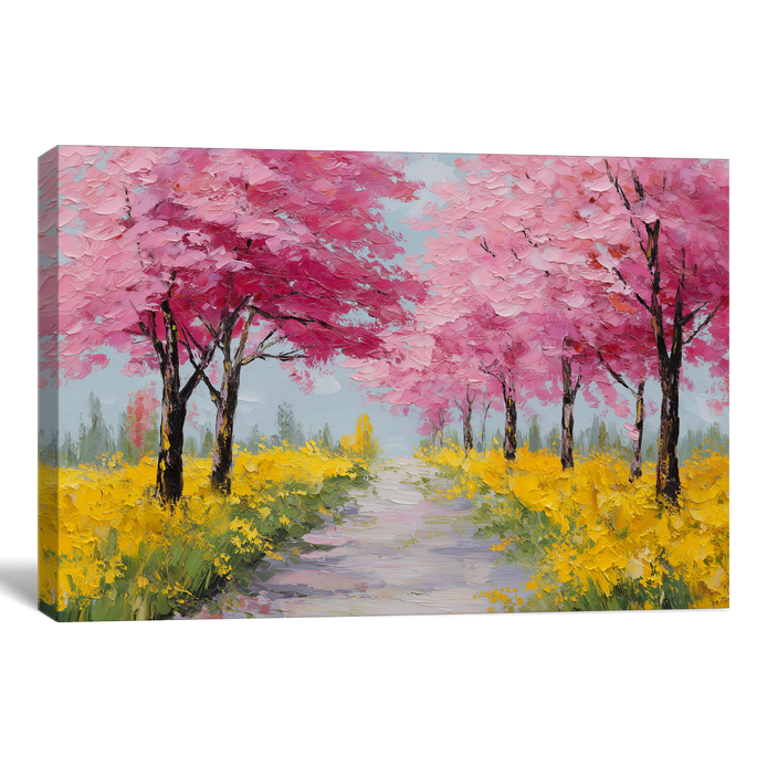 A picturesque path flanked by bright pink cherry blossoms and vibrant yellow flowers captures the cheerful beauty of spring. The composition features vivid colors and detailed flora, creating an intimate, scenic mood. This piece is an ideal decorative focal point for living rooms, offices, or bedrooms.