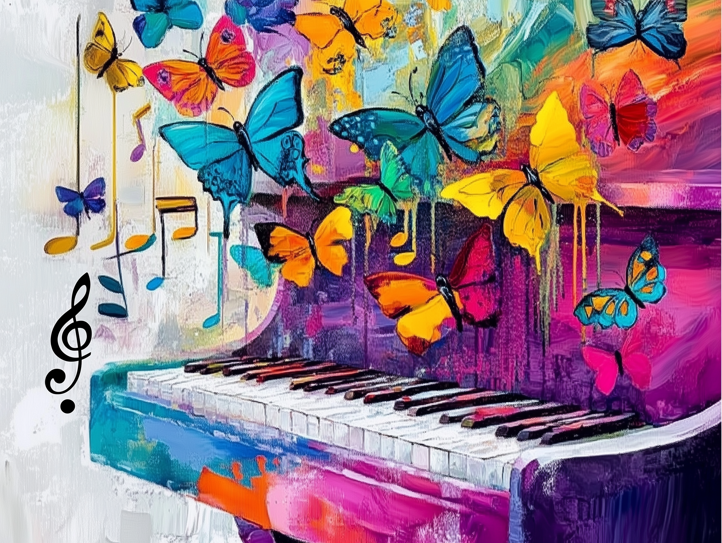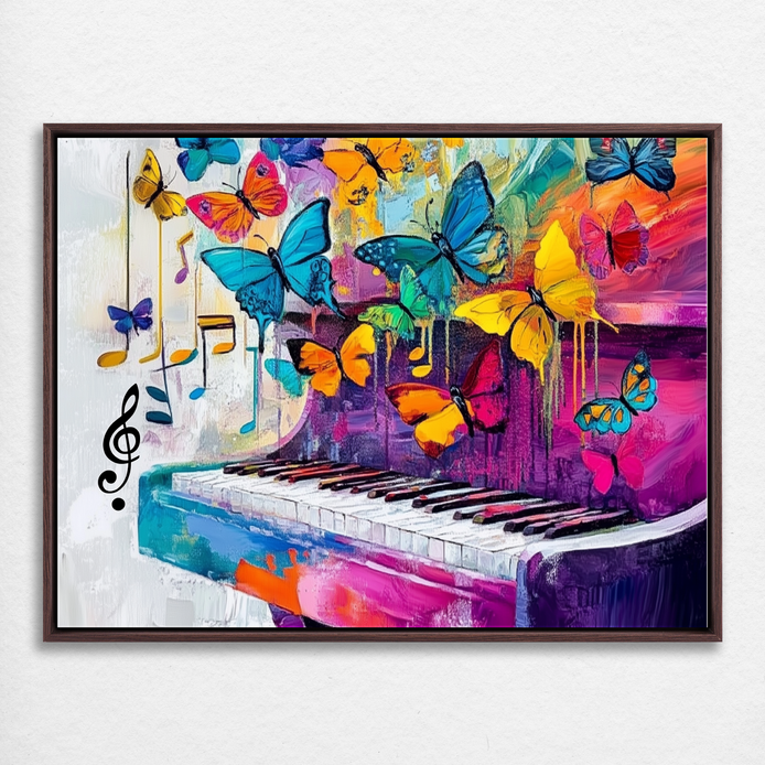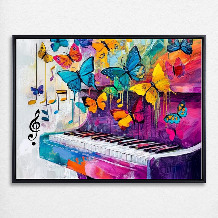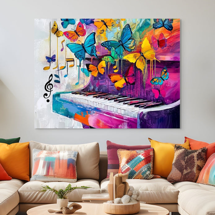 This hand-painted wall art presents a striking combination of a vivid piano adorned with a cascade of vibrant butterflies. Each detail bursts with color, capturing the essence of creativity.
