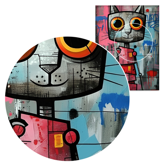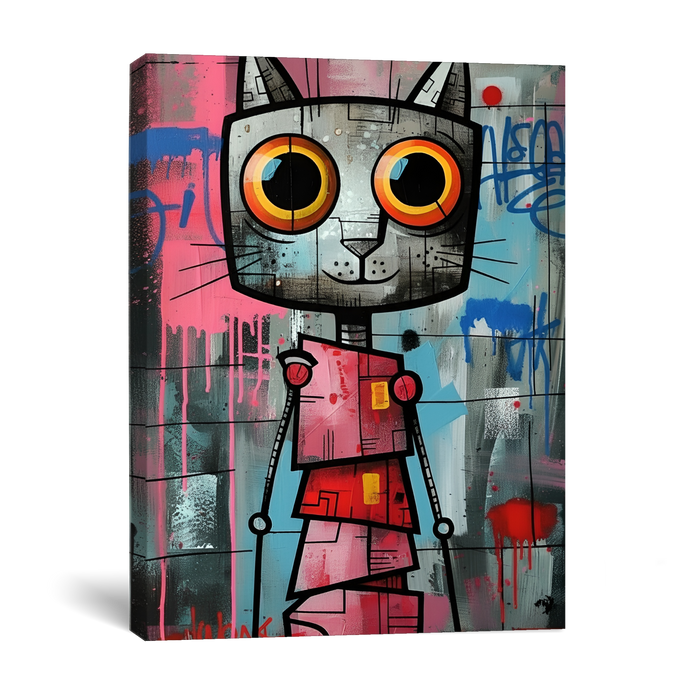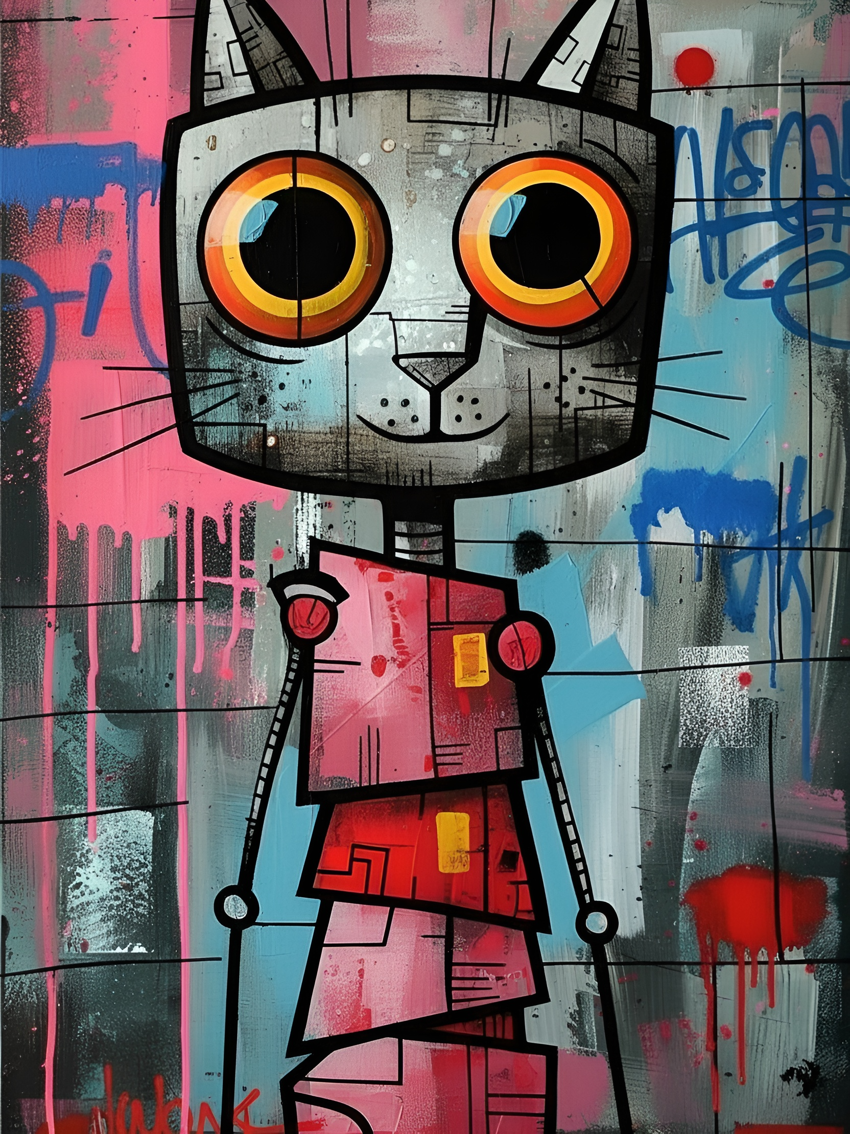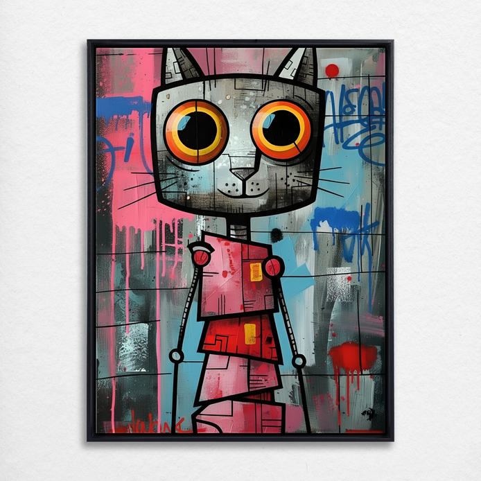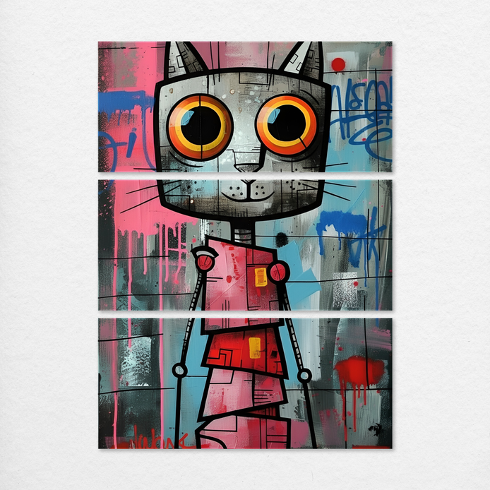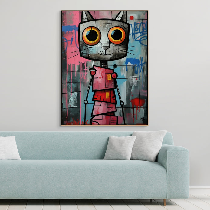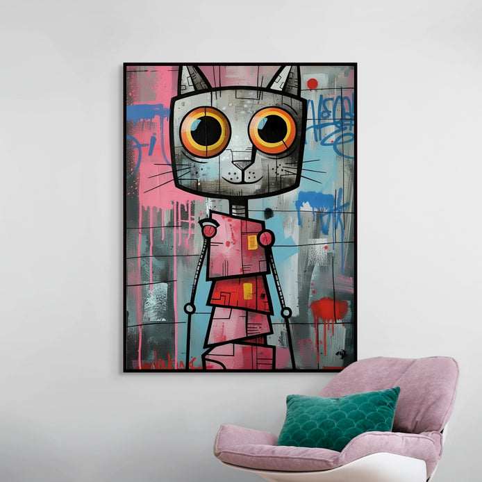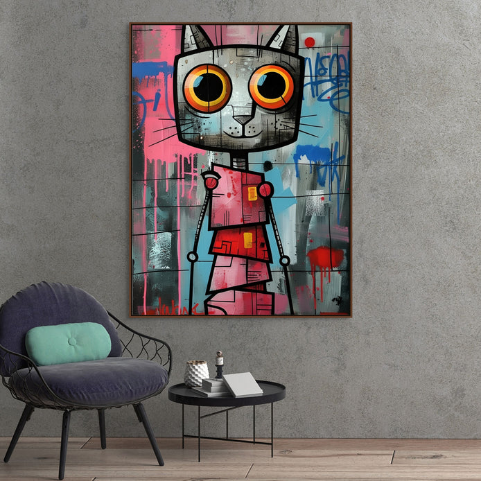 This hand-painted wall art features a whimsical cat character with large expressive eyes. Its vibrant colors and abstract design create an energetic and playful atmosphere that enhances any space.