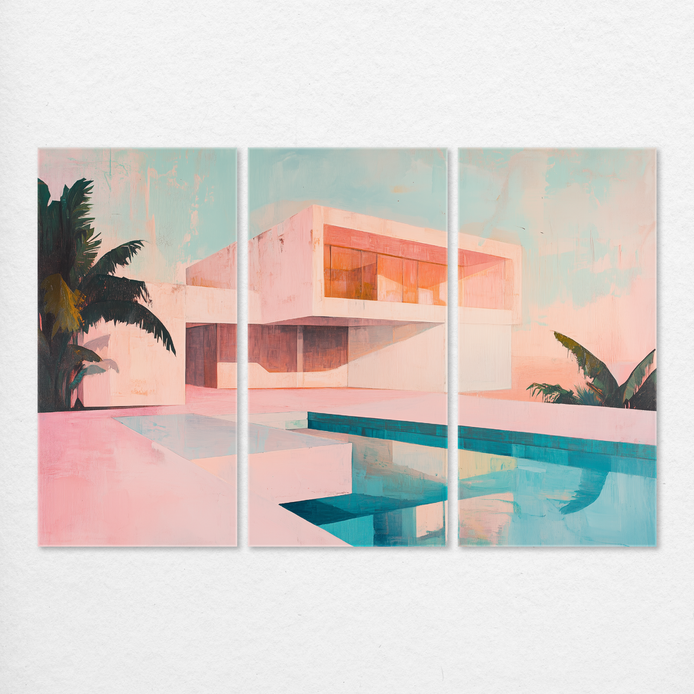 This pastel composition captures the tranquil elegance of a summer morning, showcasing sleek architecture reflected in calm waters. The design utilizes dreamy colors and balanced forms to create a refined, contemporary aesthetic. It is an ideal accent for decorating living rooms, bedrooms, dining areas, hallways, or offices.