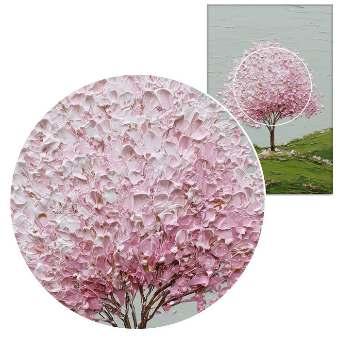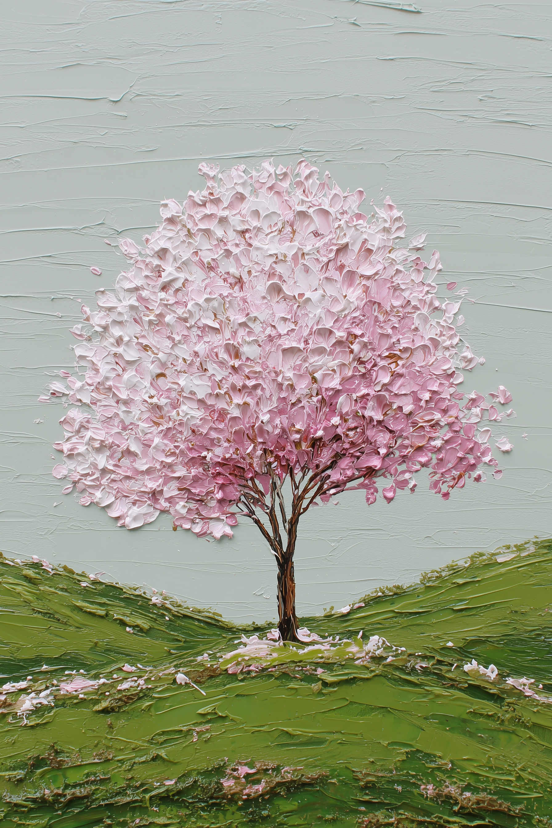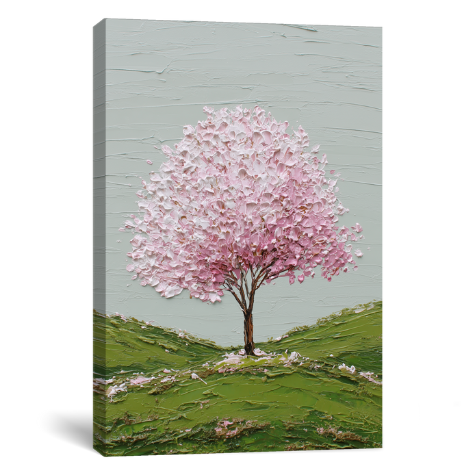 This hand-painted wall art features a beautiful cherry tree with delicate pink blooms in a lush green landscape.