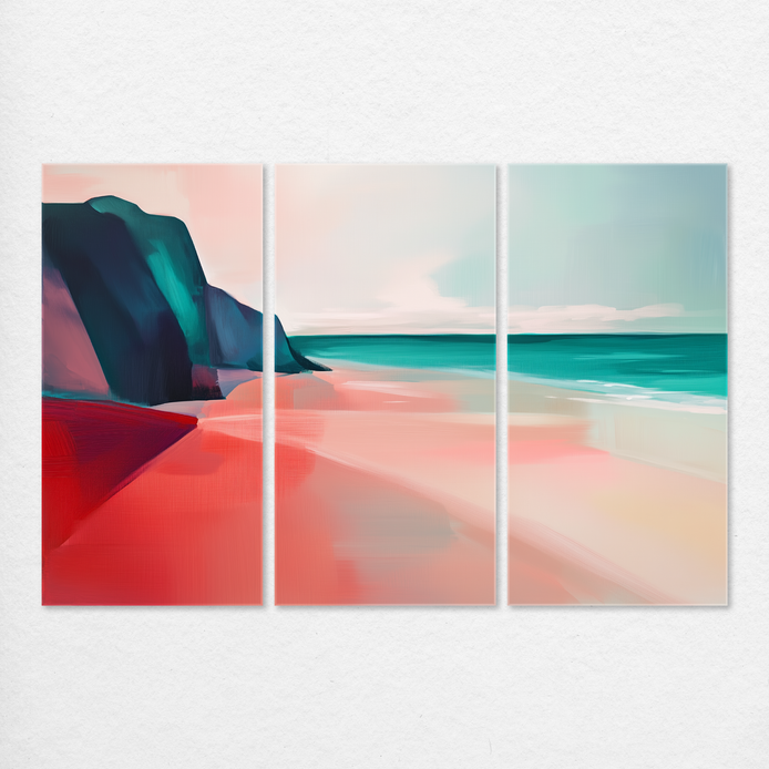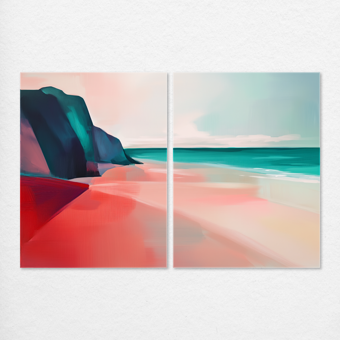 This mesmerizing scene evokes the tranquility of a secluded beach at dawn, conveying a mood of serene escape. The composition blends dreamy pink hues with cool turquoise waters, offering a soft, evocative coastal palette. This piece is ideal for adding a tranquil touch to living rooms, bedrooms, or offices.