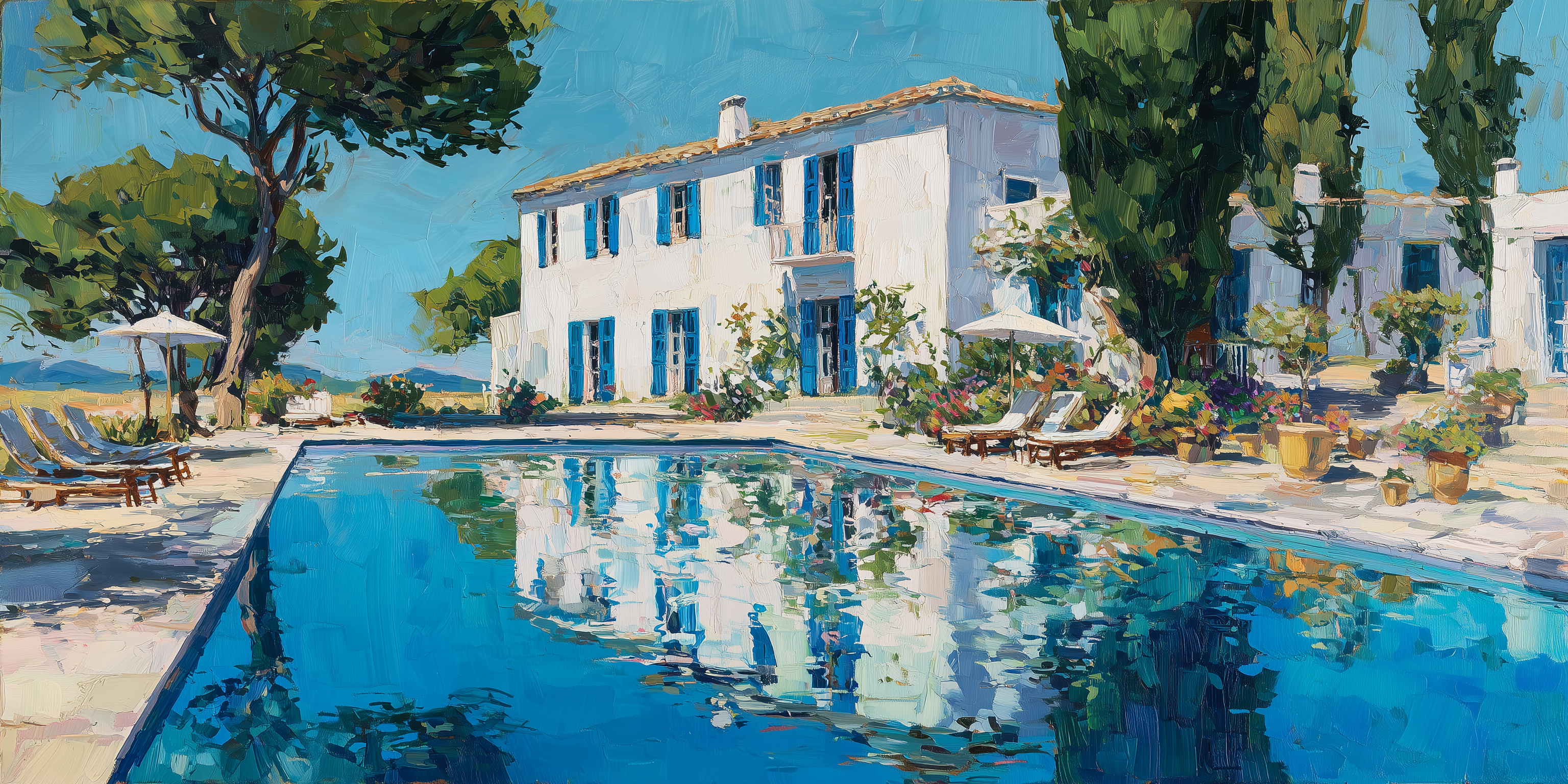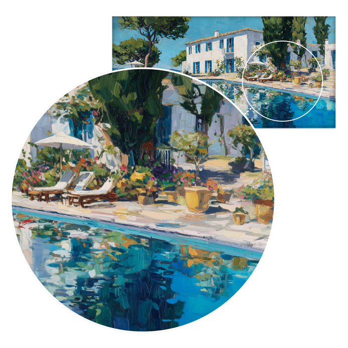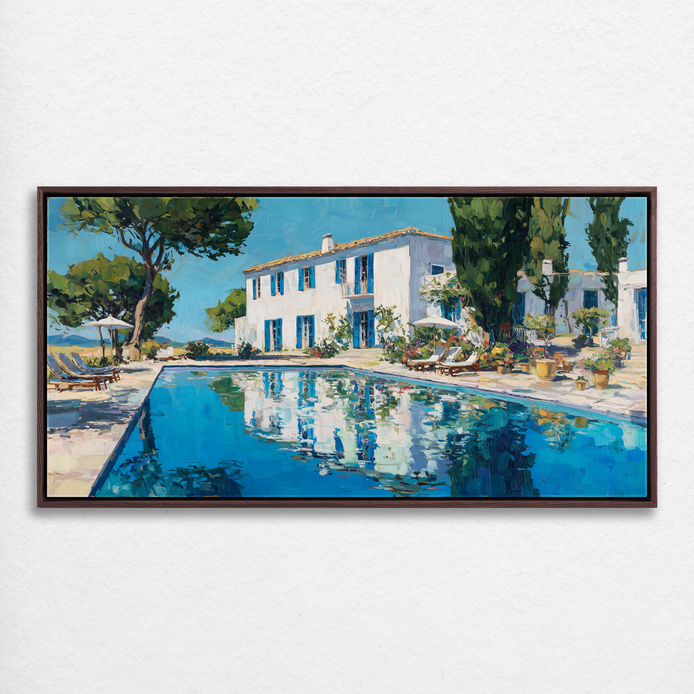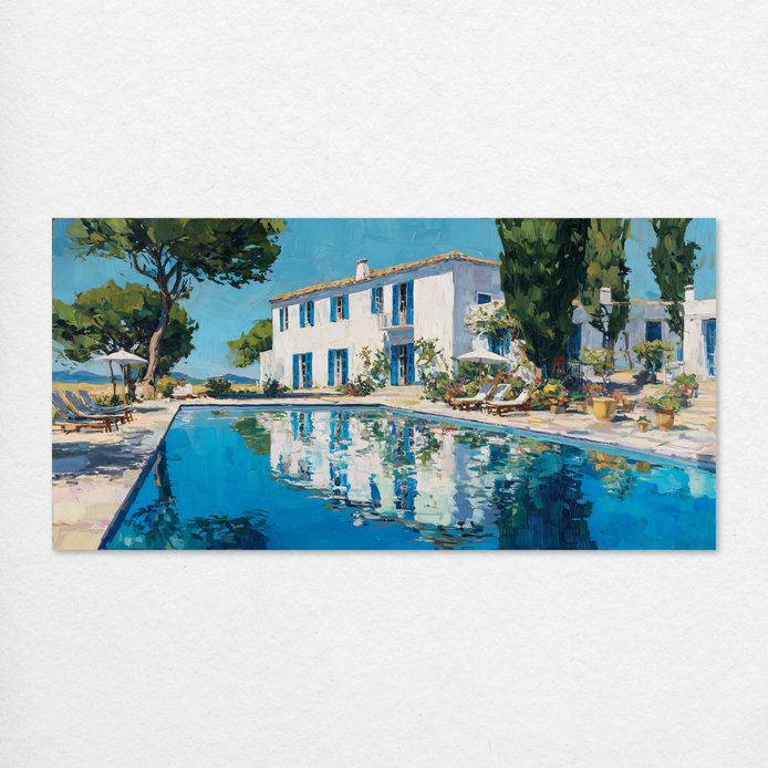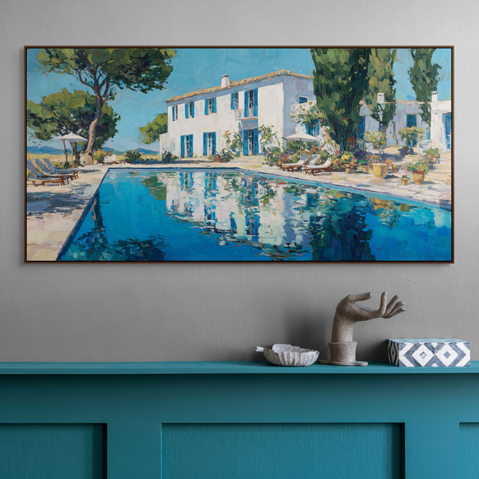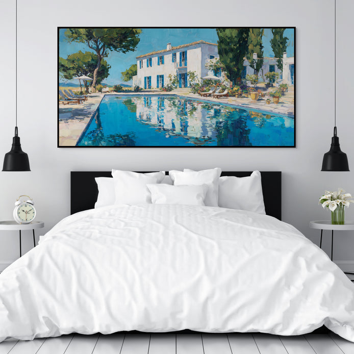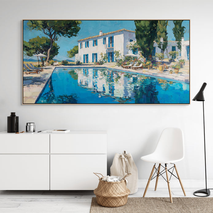 A charming villa beside a glistening pool radiates the peaceful ambiance of a sunny day. This composition features vibrant colors and lush greenery, creating an idyllic Mediterranean mood. It is an ideal decorative choice for enhancing living rooms, bedrooms, dining areas, hallways, or patio spaces.