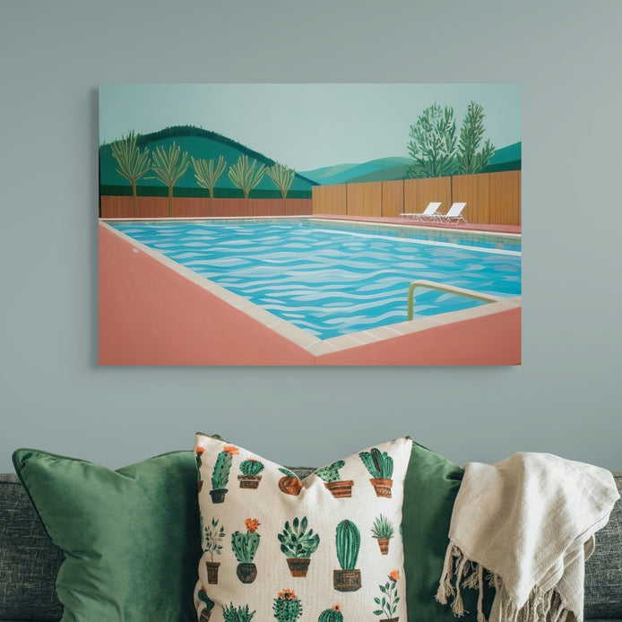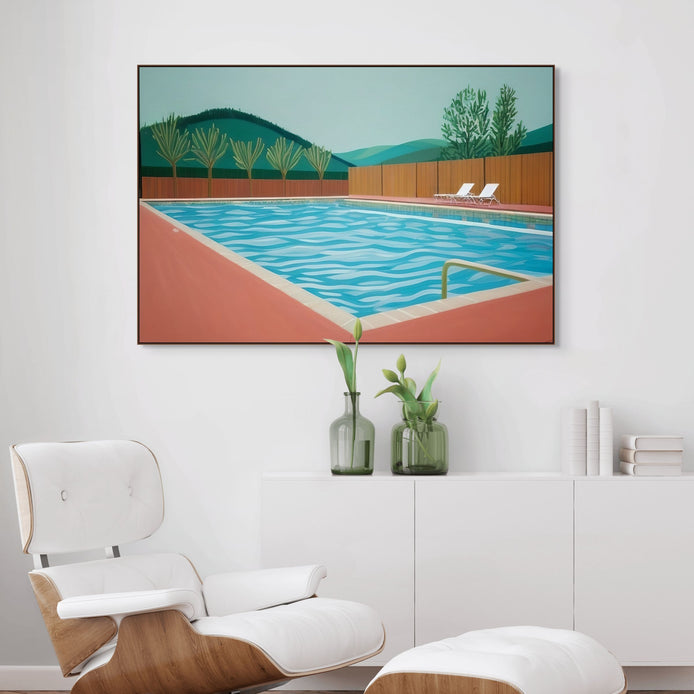 This hand-painted wall art captures a peaceful swimming pool surrounded by lush mountains and palm trees. The vibrant colors and waves add depth to the original artwork.