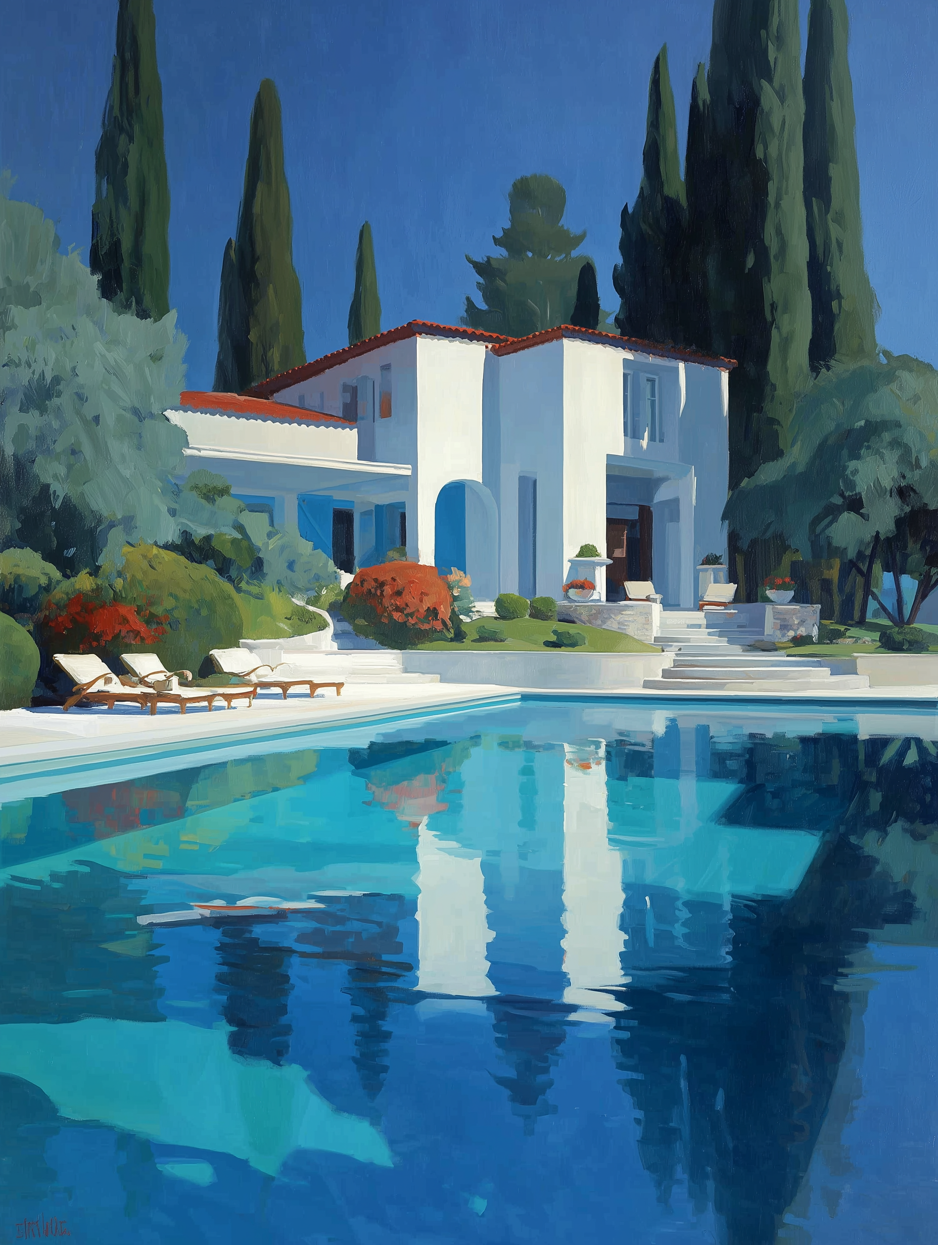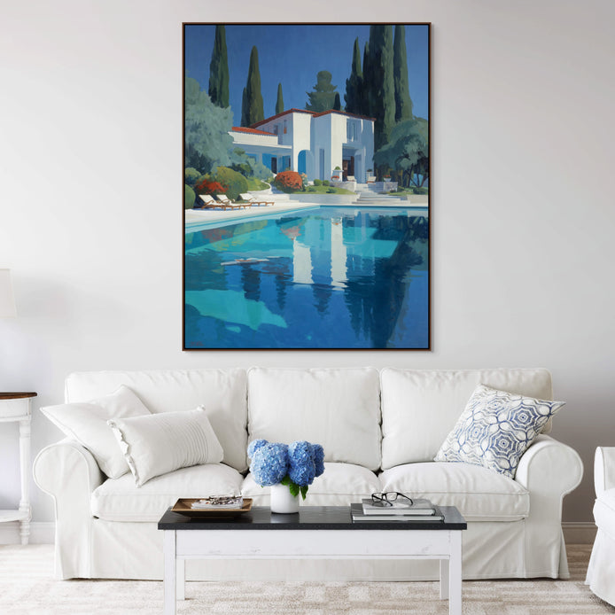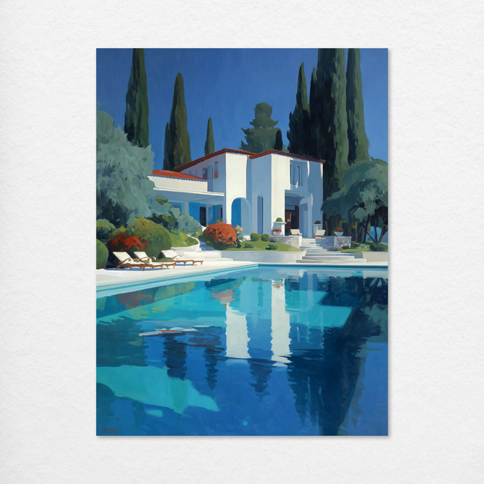 A stunning Mediterranean villa and its reflection in a vibrant blue pool create a deeply serene atmosphere. The composition utilizes vibrant color and defined forms against lush greenery to evoke a stylish, peaceful scene. This evocative view is ideal for enhancing the ambiance of living rooms, bedrooms, or patio spaces.