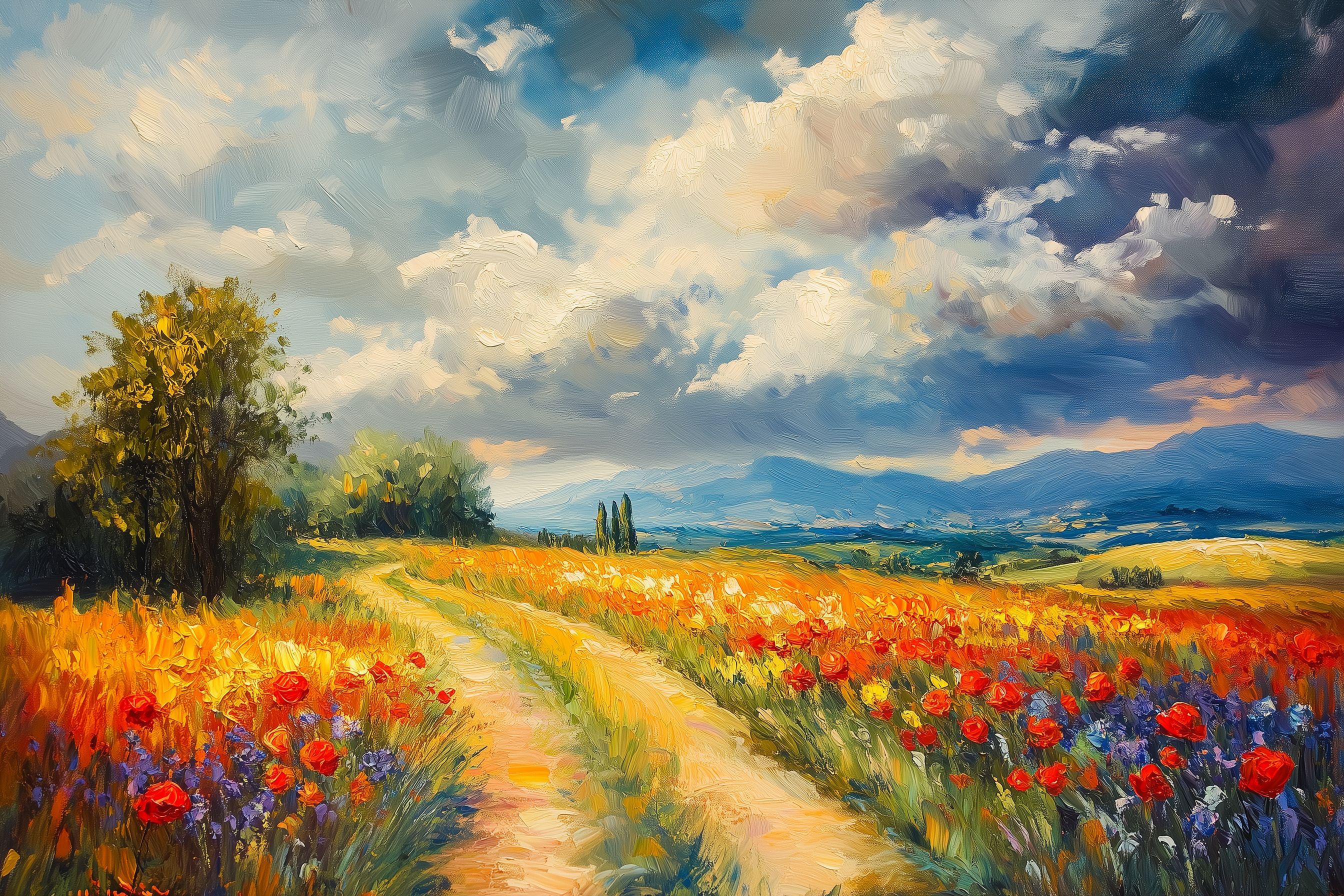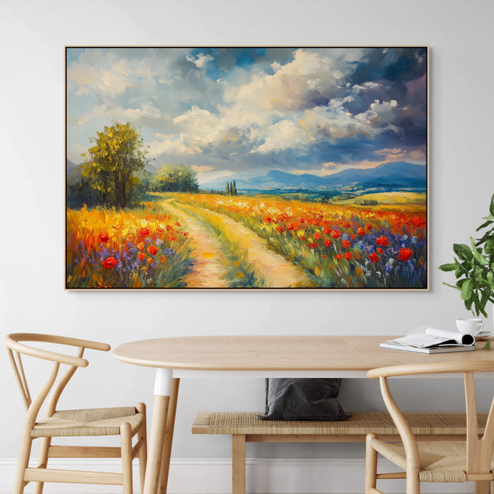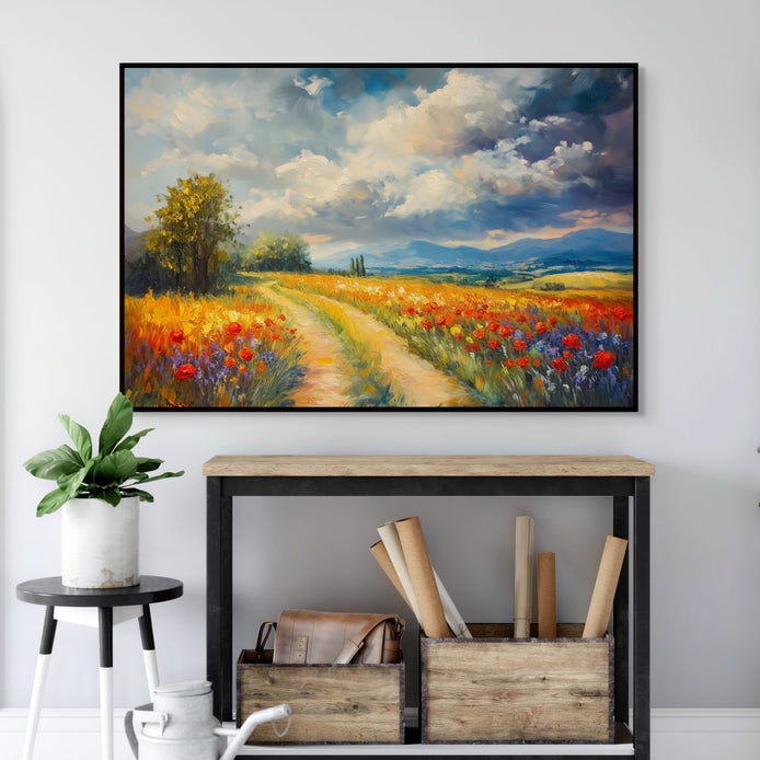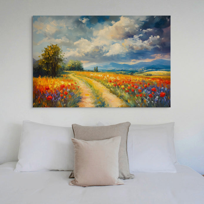 This hand-painted wall art features a picturesque landscape with a winding path through lush fields of colorful blooms. Dramatic clouds hover above, capturing a moment of natural beauty.
