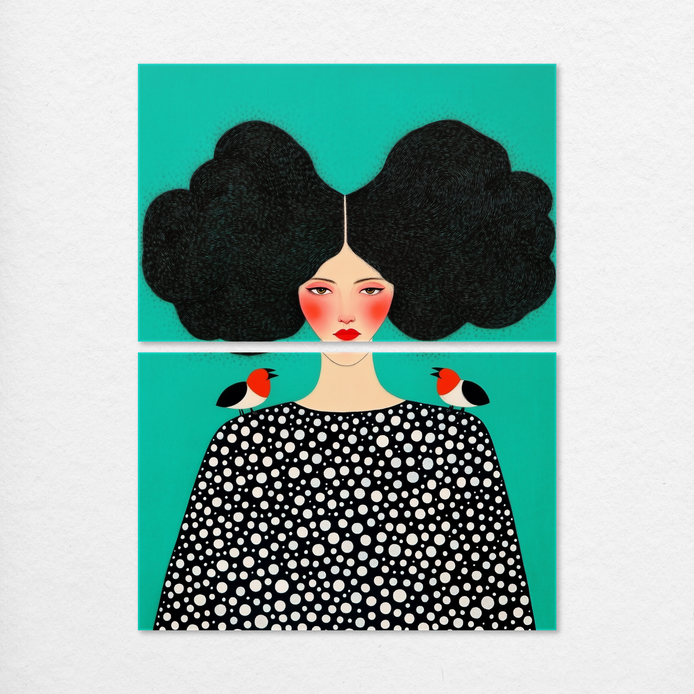 A whimsical hand-painted fusion of nature and portraiture, featuring vibrant florals and an endearing bird companion. It celebrates creativity and individuality.