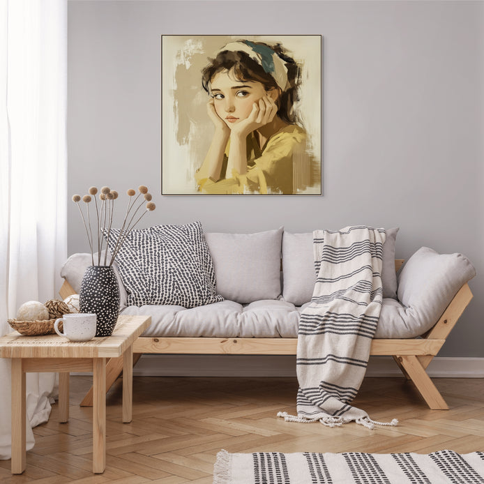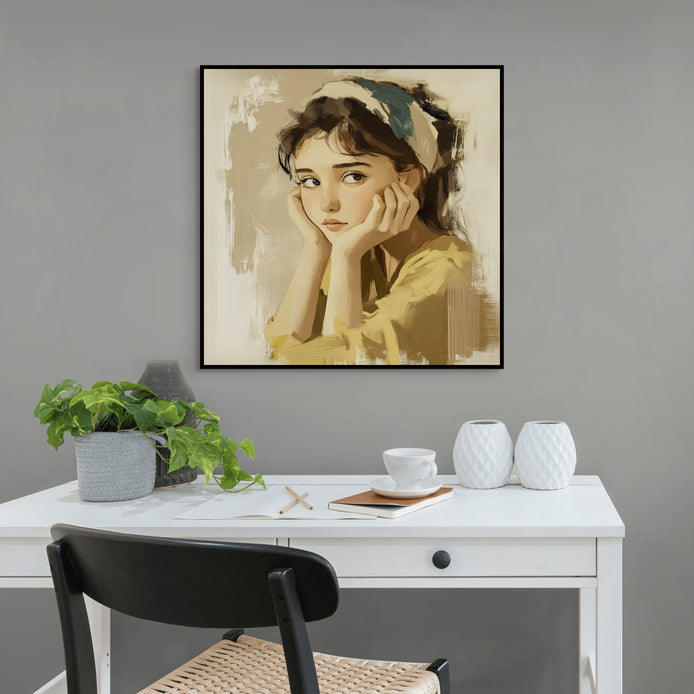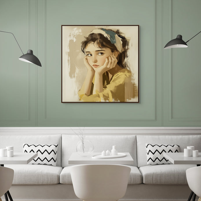 Hand-painted wall art captures a thoughtful young woman in a quiet moment. Soft hues emphasize the calm mood and reflective emotion.