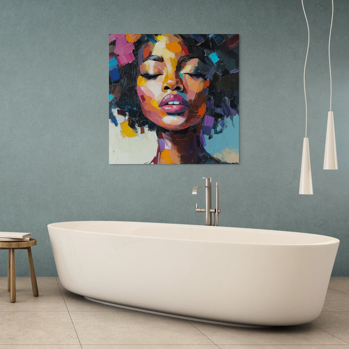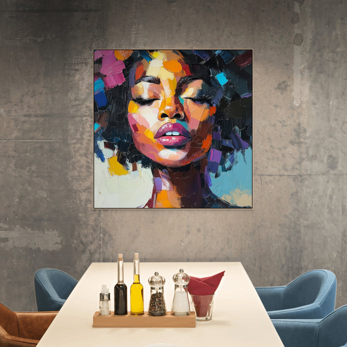 Hand-painted wall art brings a quiet intensity to life through a luminous portrait of a serene woman, blending emotion with expressive color.
