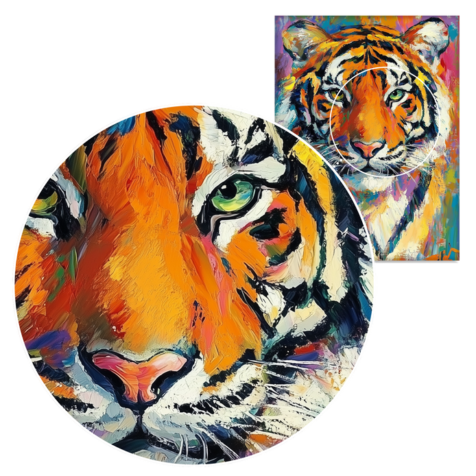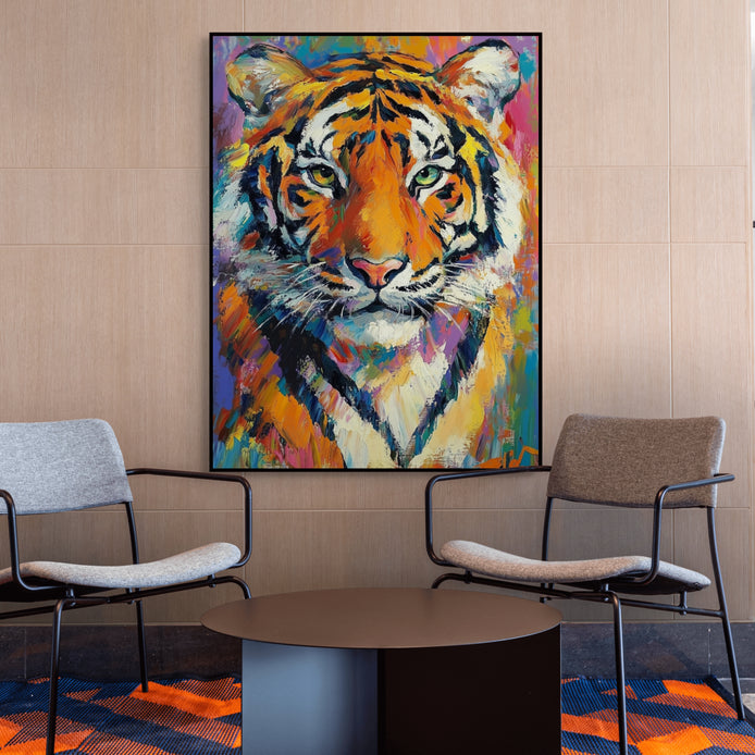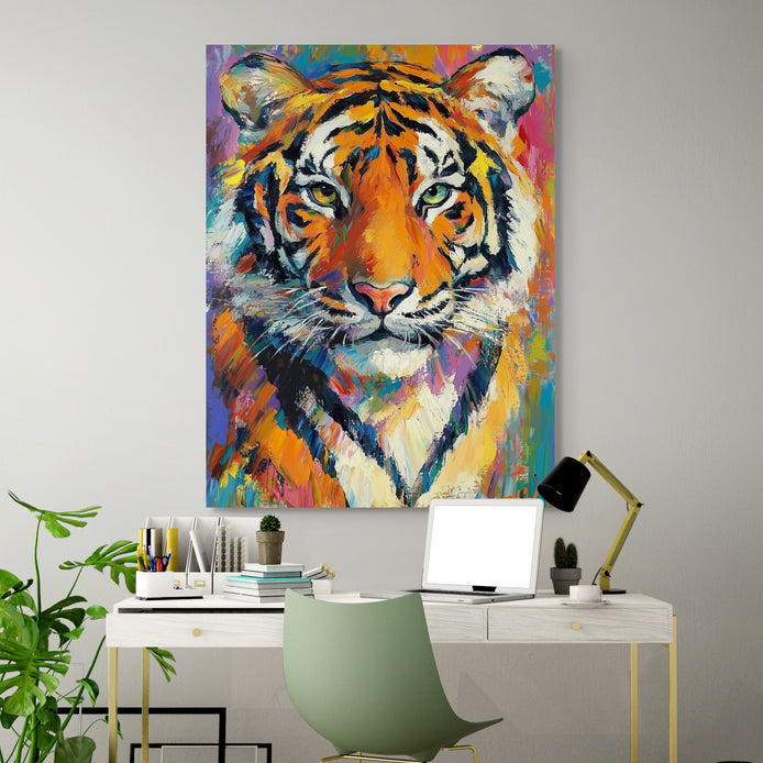 This hand-painted wall art showcases a striking tiger with vivid orange and black stripes. Bold colors blend to create an eye-catching piece that captures the essence of wildlife artistry.