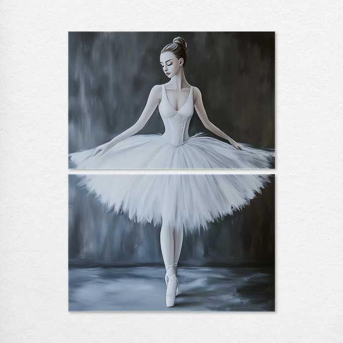 A poised ballerina in a flowing white tutu evokes a mood of elegant tension and grace. The composition uses sophisticated light and shadow effects against soft, moody tones. This refined piece is an ideal decorative statement for living rooms, bedrooms, or offices.