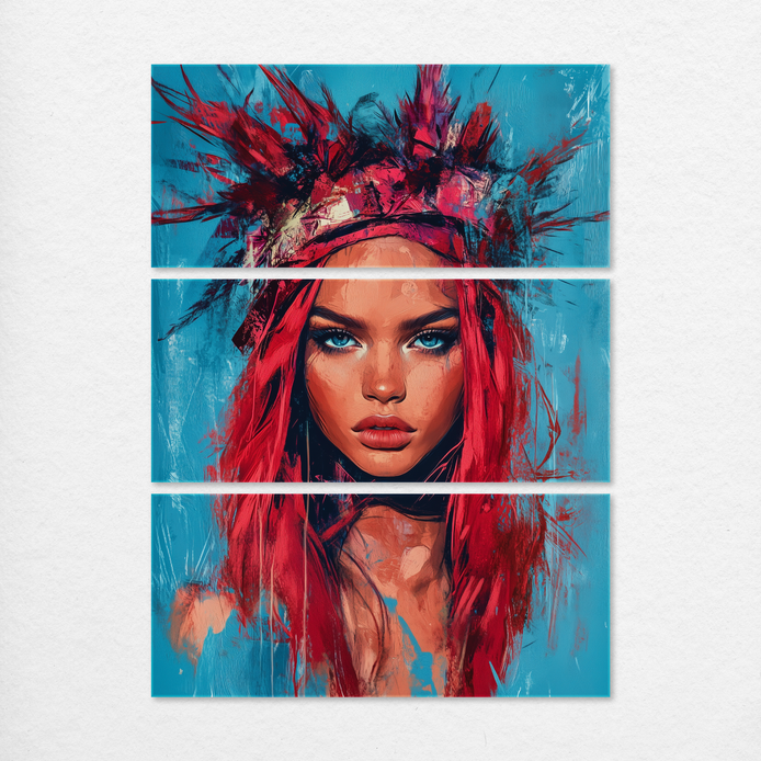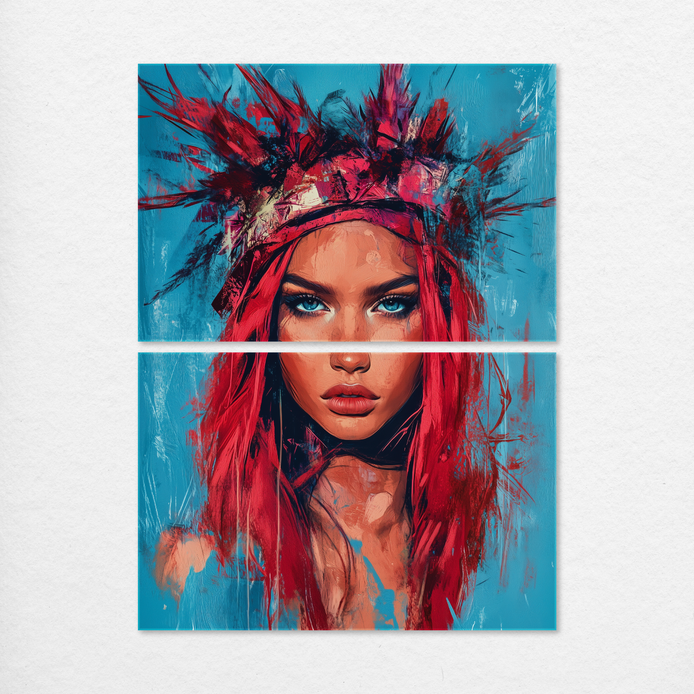 A hand-painted fusion of bold reds, turquoise, and earthy hues creates a powerful feminine presence. The feathered accents and gaze evoke quiet wisdom and empowerment.