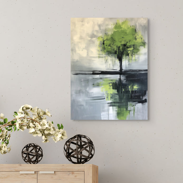 A hand-painted tree stands alone against a dreamlike, muted background. Its vibrant green leaves and reflective water evoke peace and introspection through gentle transitions and bold strokes.